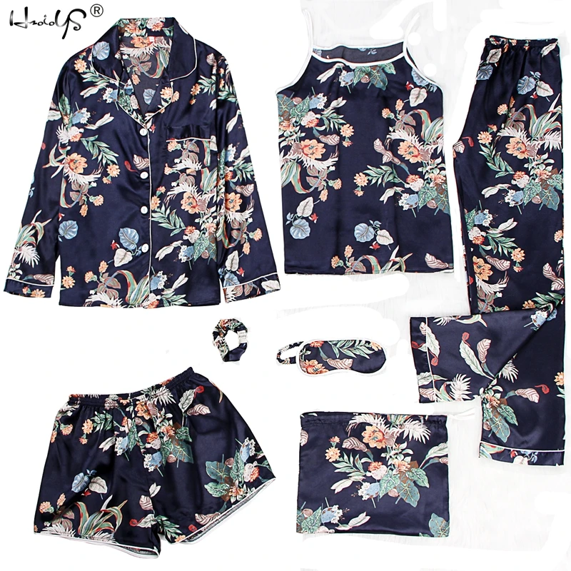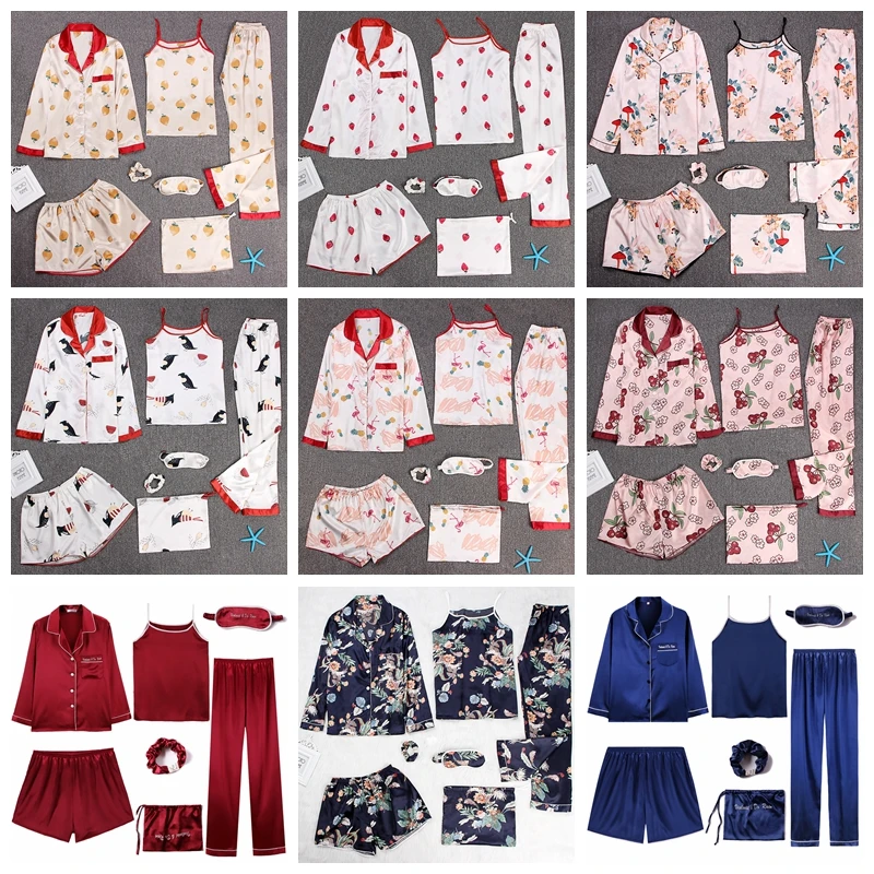 Пижама из 7 предметов, пижамный комплект для женщин, весна-лето 2019, сексуальные шелковые пижамные комплекты, Атласный пижамный костюм, милый Ночной костюм, домашняя одежда