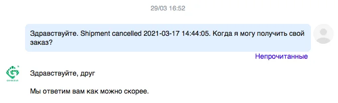 Выбрал магазин по рекомендации с Ютуба. Однако опыт оказался печальным: спустя 5 недель заказ так и не получен, в отслеживании только одна запись: Транспортировка отменена. Мои письма к продавцу не имели ответа, оставались в статусе Непрочитано. Спасибо AliExpress, спор разрешили за неполные сутки, деньги вернули. Будьте осторожны