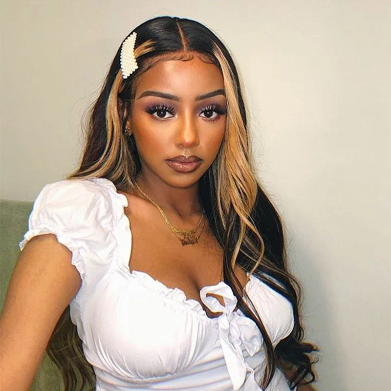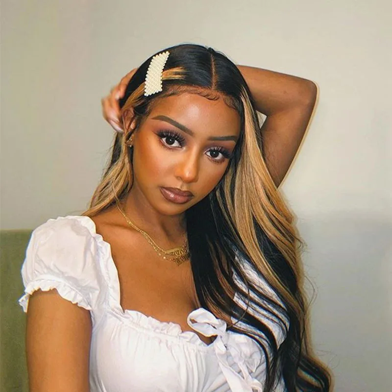 Парик плотности 250, парик с Т-образной частью, парики из человеческих волос на сетке спереди для женщин, парик с волнистыми волосами, бразильские волосы, натуральный черный с хайлайтером CARA