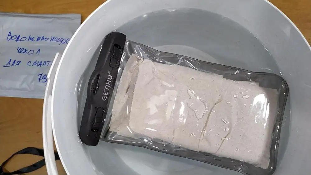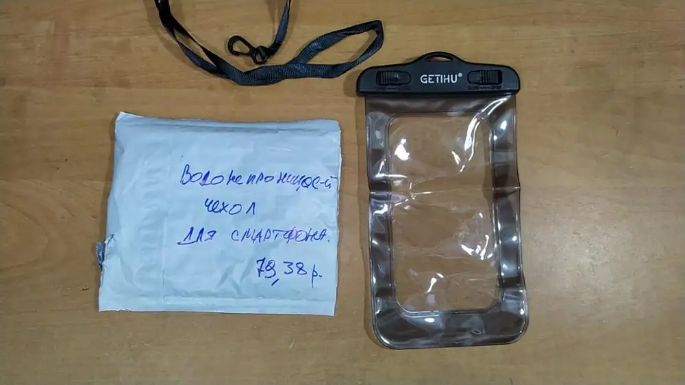 быстро доехал до СПб, дней за 8-9. Не знаю что написать, просто кусок клеёнки чтобы спрятать в него свой телефон, собственно такой же как на фото в описании, в воду не окунал и не стану пожалуй пробовать, купил чтобы на работе пылью не убивать трубку. Есть шнурок на шею в комплекте