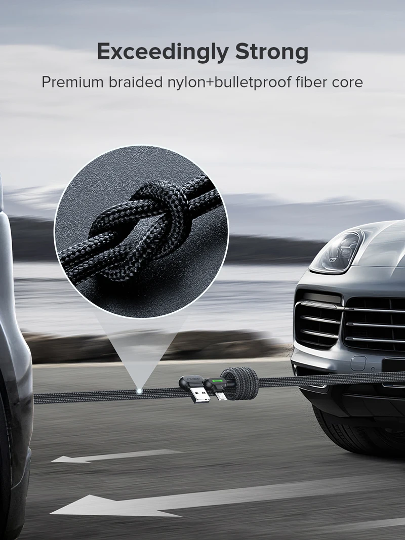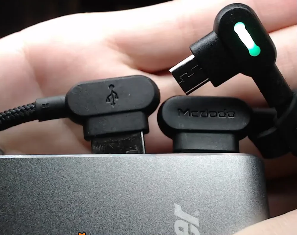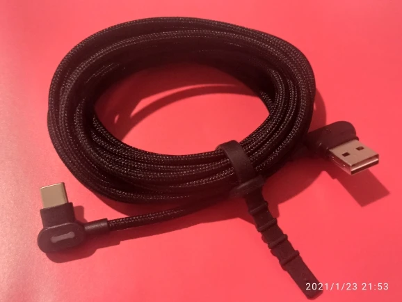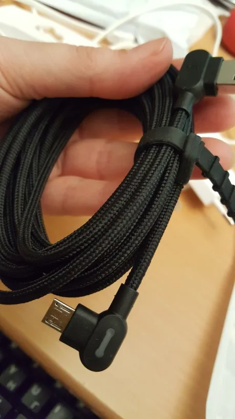 Зелёная лампочка индикации горит ярче с круглой стороны Micro порта. По непонятной мне причине не имеет таких же засечек на USB A для уплотнения крепления в гнезде. К сожалению оба таких кабеля не влезают в мой портативный аккумулятор и упираются буквально несколько миллиметров о заднюю часть сгибающегося провода. Держится крепко, из гнезда не выпадает, просадок по питанию не замечал, насчёт скорости не скажу. Кабель отлично подошёл для соединения моего RPI с сенсорным экраном внутри сумки органайзера до соседнего отсека. 51 сантиметр до угловых насадок.