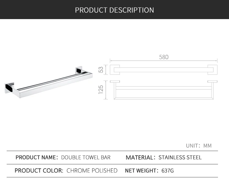 Полированная sus304 нержавеющая сталь аксессуары для ванной комнатыВесь металл: изготовлен из нержавеющей стали, обеспечивая качество и долговечность.Технические характеристики-Материал: T-304 нержавеющая сталь-Отделка: полировка-Способ установки: настенныйДвойной держатель для полотенец