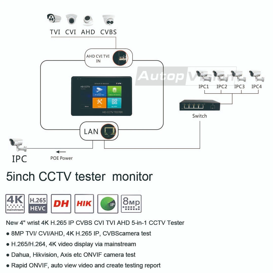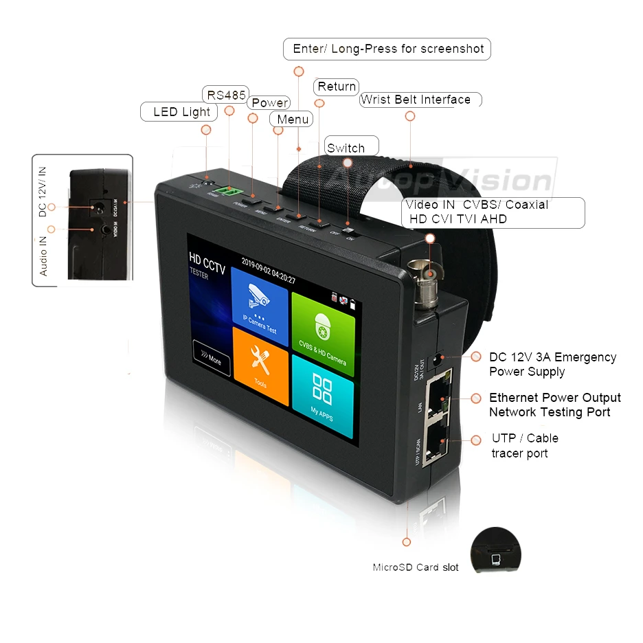 IP5200 plus: 4-дюймовый сенсорный экран/8MP TVI / 8MP CVI / 8MP AHD / 4K H.265 IP / CVBScamera тест/HDMI VGA in/SDI тест
