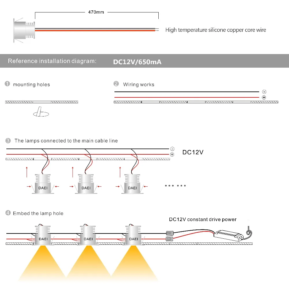 4. Входное напряжение на Точечный светильник имеет 3 в/300 мА и 12 В, 3 в соединены в серии и 12 В соединены параллельно, пожалуйста, обратите внимание и выберите правильный источник питания.