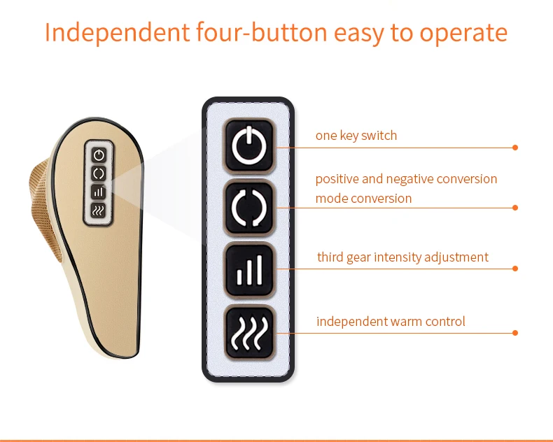 От вверх до вниз.Это:1. Кнопка включения/выключения для запуска и закрытия массажера.2. Кнопка направления для переключения направления головок массажера. Вперед и назад3. Кнопка скорости для изменения скорости массажных головок4. Кнопка нагрева для открытия или закрытия нагрева