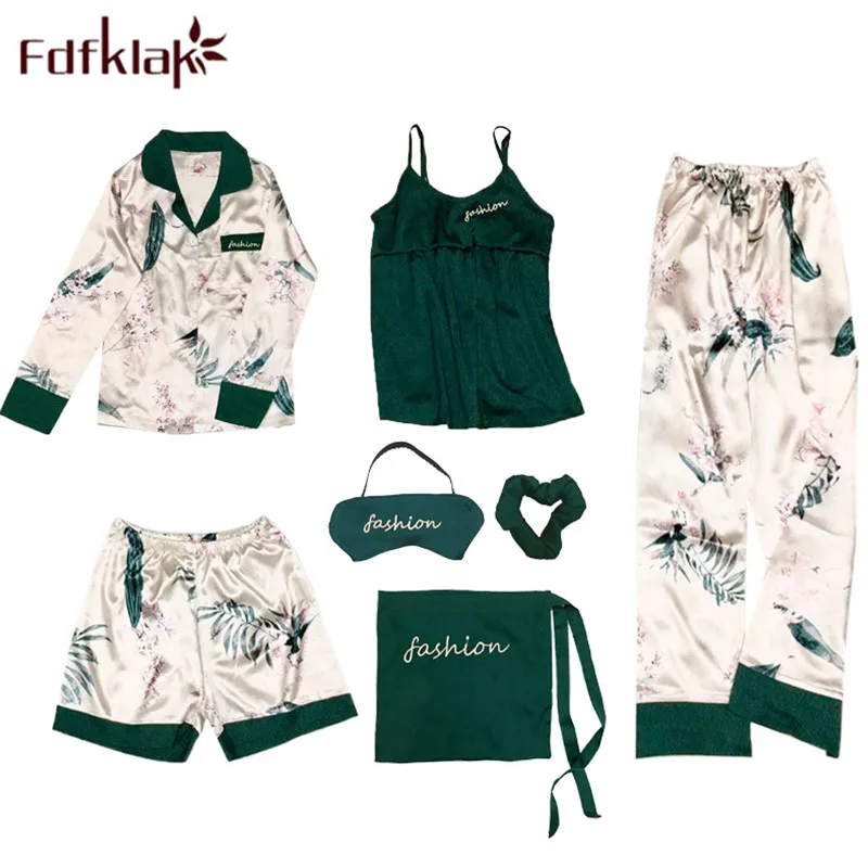 Fdfklak, сексуальные пижамы для сна, 2018, весенне-летняя пижама из искусственного шелка, комплект из 7 предметов, пижама, Femme, домашняя одежда с цветочным рисунком, Q1139