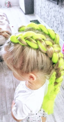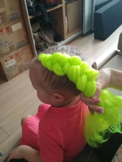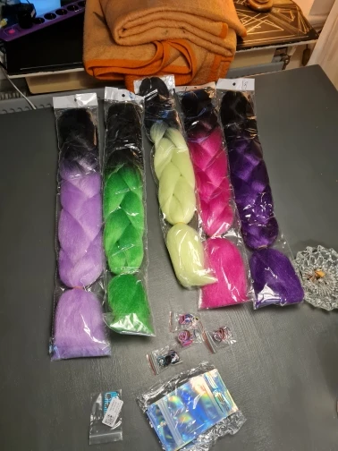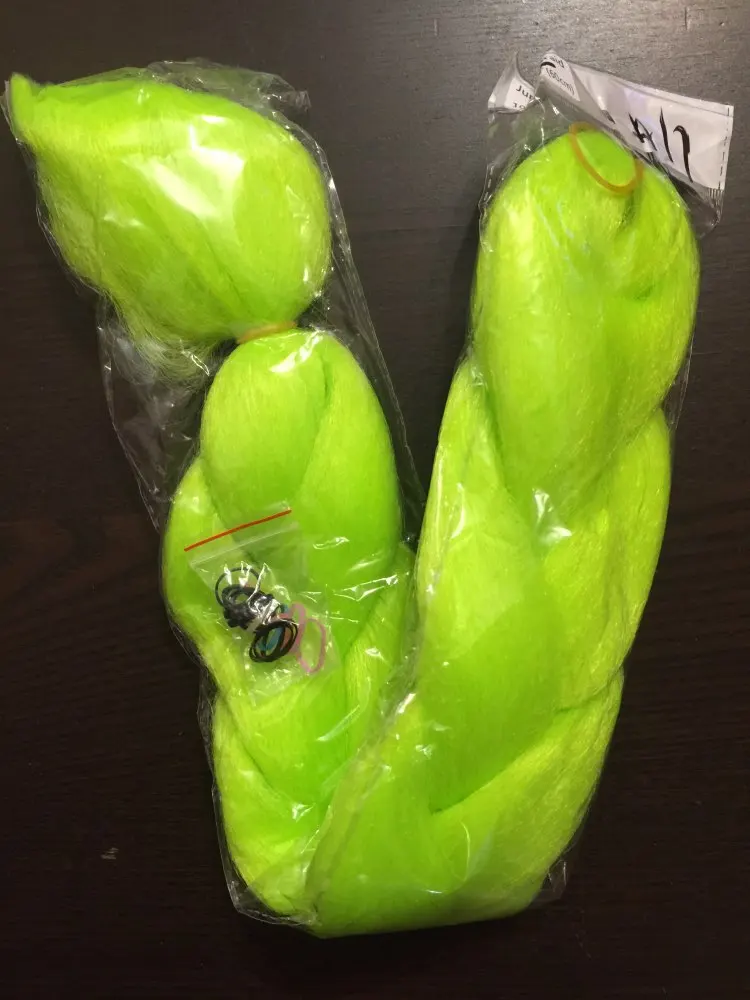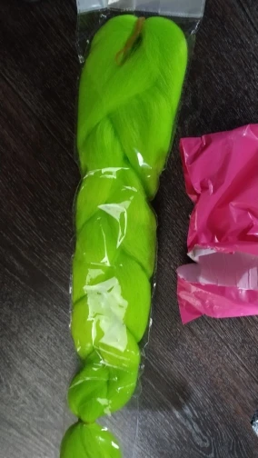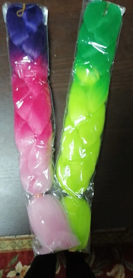 Супер!!! Доставка чуть больше 2 недель до Краснодарского края, заказываю уже не в первый раз!!! Дочке нравится, не путаются, плести легко, цвет кислотный, лучше разбавить темными цветами, что я и сделала. На прическу ушло 2,5 пачки + 1 пачка чёрного цвета.