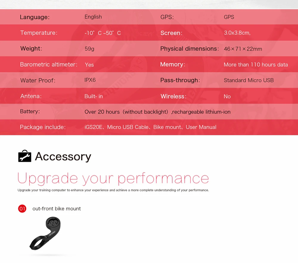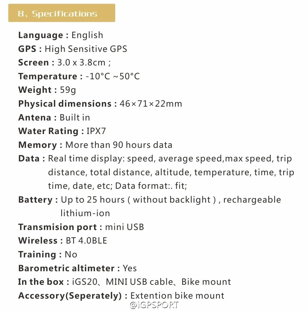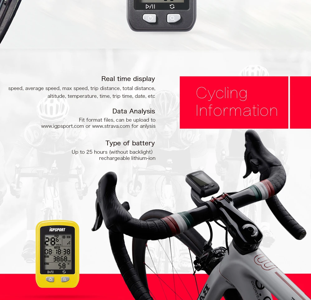 IGS20E GPS велосипедный компьютер поддерживает Высокочувствительный gps-приемник для быстрого позиционирования. Отображение в реальном времени: скорость, средняя скорость, максимальная скорость, расстояние поездки, общее расстояние, высота, температура, время, дата, калории. До 25 часов работы. Умное включение/выключение подсветки при восходе и закате солнца. Поддержка загрузки файлов на www.igpsport.com (подходящий формат) для анализа.