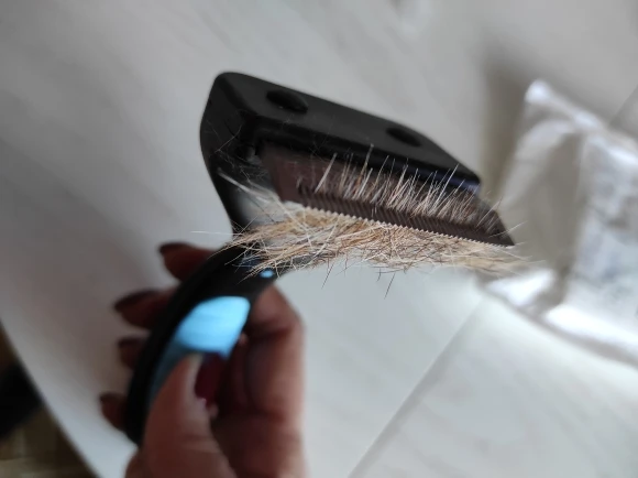 Расческа очень понравилась! Убирает очень много шерсти. Но мне кажется, не вычесывает, а срезает. Для длинной шерсти подошла прекрасно, а для короткой почти бесполезна. Но я довольна!