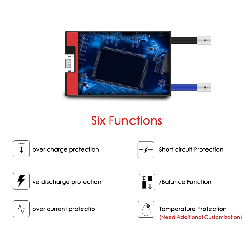Основные функции: защита от перезарядки, защита от разрядки, защита от перегрузки по току, защита от короткого замыкания, защита от температуры и т. д.