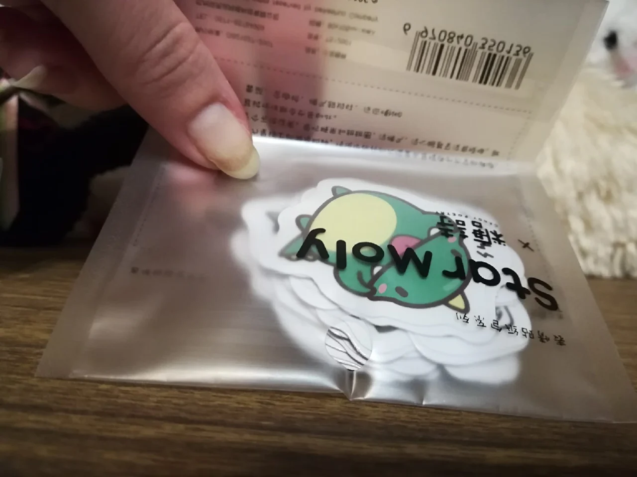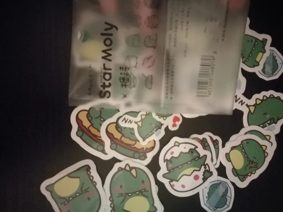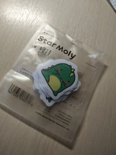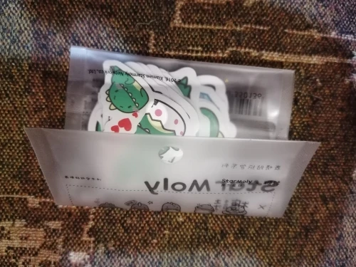 Милейшие наклеечки с динозавриком! Брал не себе, поэтому упаковку не вскрывал, которая фирменная и запаяна на совесть (что большая редкость для вещей в стоимость меньше доллара). Через отверстие в упаковке потрогал наклейки, все гладкие, и хорошего качества. Доехали за месяц в МО