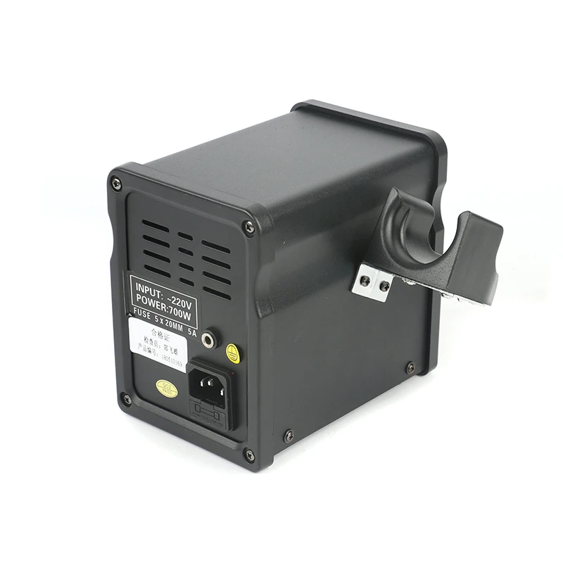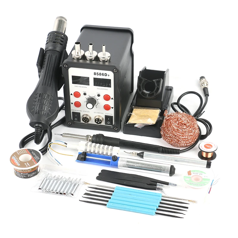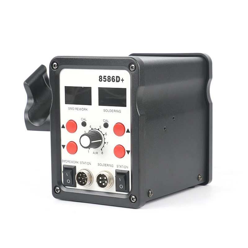 Это совершенно новая паяльная станция 2 в 1 SMD 8586. Металлический корпус из сплава с высококачественным силиконовым корпусом отличается элегантным внешним видом и энергосбережением. Вы можете использовать пистолет горячего воздуха и паяльник отдельно, без помех друг с другом.