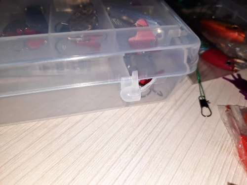 заказ шел почти три месяца. комплект максимальный. все как в описании. пришло в двух коробках,большая основная и маленькая с мелкими блеснами. Большая коробка сломана,причем не почтой ,тк в пакете обломков нет.Делаю вывод,что поломаную коробку с приманками положил продавец. это минус.придется покупать новую. Эта не закрывается.