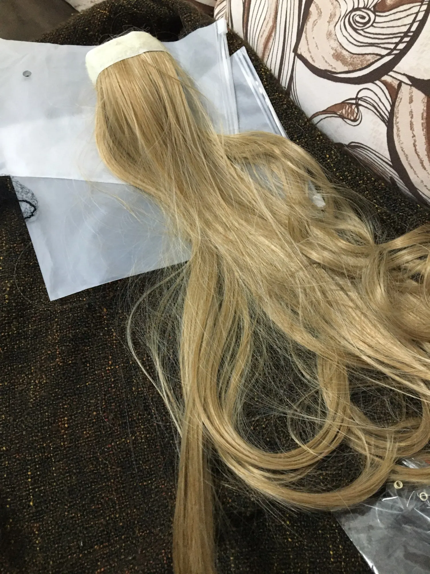Хорошие волосы. Совпали по тону с моими. Темно русые, но не чёрные. Доставка быстрая. Хвостик достаточно густой, на голову прикрепляла тяжелый. Приехал хорошо запакован. В индивидуальном мешочке от пыли и сеточке. Есть небольшой блеск, но это зависит от освещения. Одевается не сложно, можно разобраться. Спасибо продавцу.