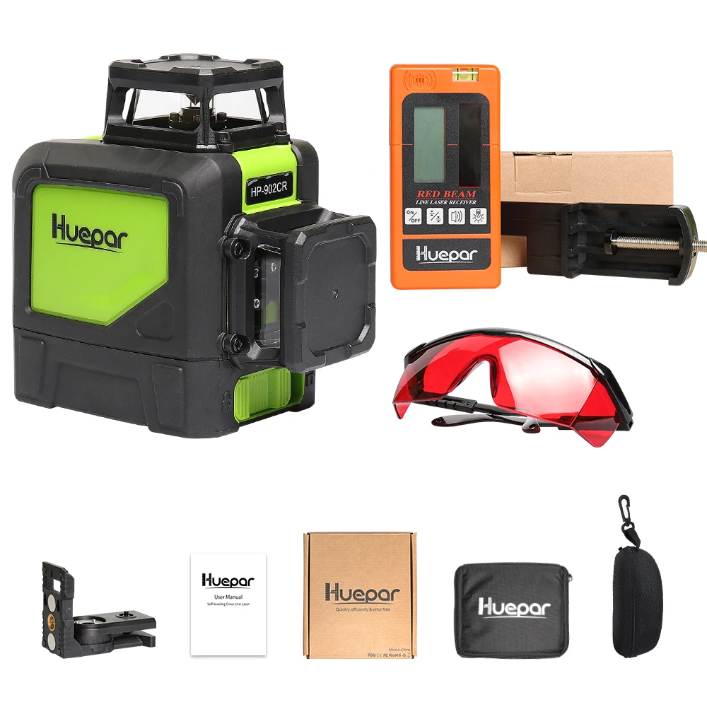 1 * Красный лазерный уровень Huepar 902CR(Без аккумулятора)1 * магнитное основание поворота1 * Красная оконечная пластина1 * чехол1 * многоязычное Руководство пользователя
