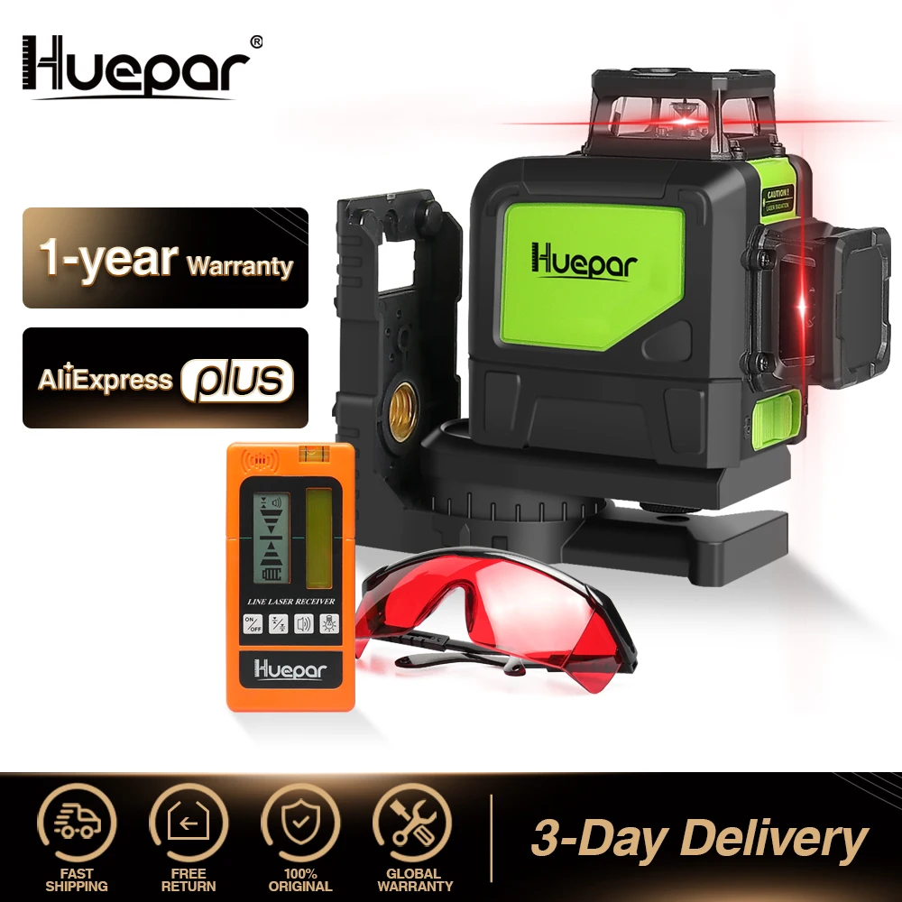 Huepar лазерный уровень, 8 линий, красный, 360 горизонтальный, вертикальный, перекрестный, самовыравнивающийся