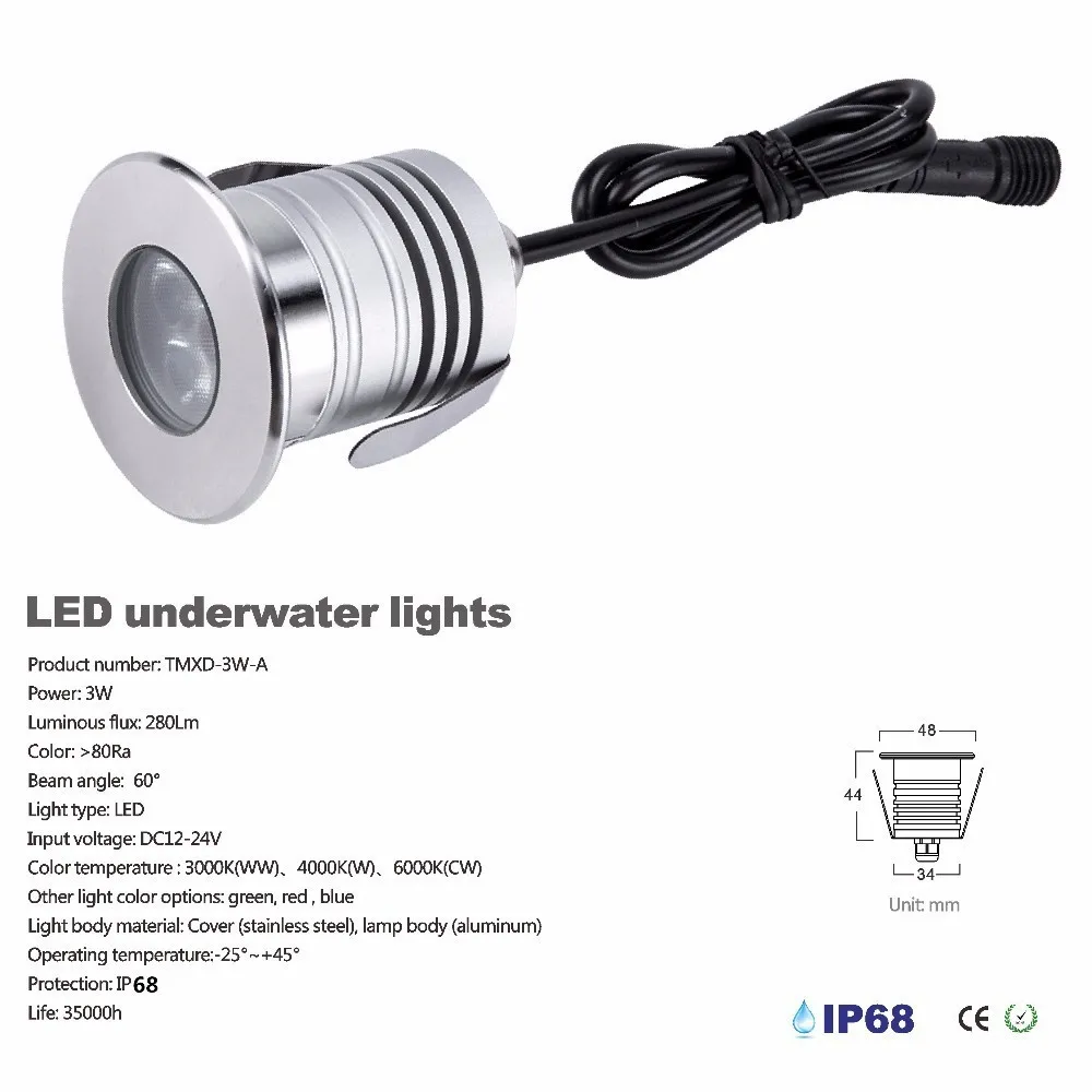 3. Светодиодный цвет освещения для подводной лампы: теплый белый, белый, холодныйWHite, И красный, зеленый, синий, нужен контракт продаж, размер тела& Phi; 48* 44 мм-3 Вт с отверстием 38 мм встроенная подсветка
