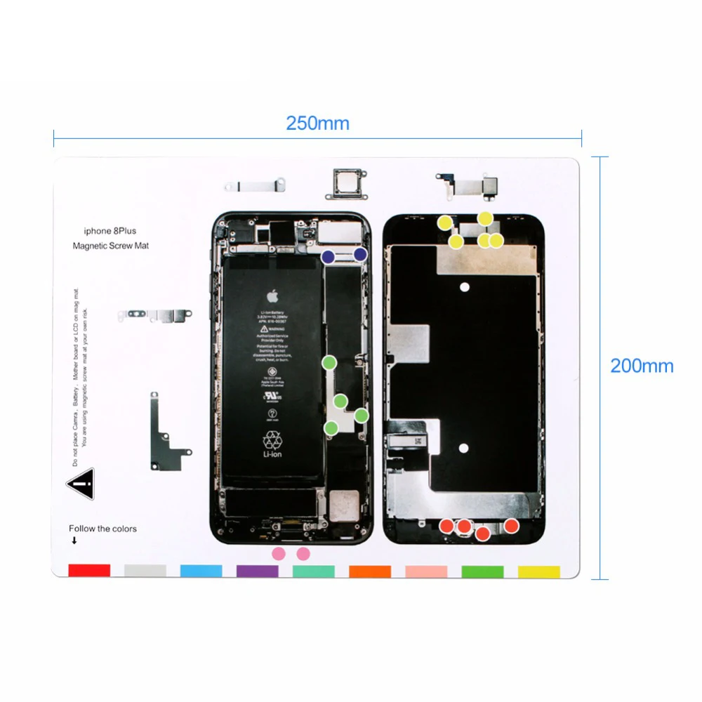 Профессиональный Магнитный винтовой коврик для iPhone.Храните все винты для телефона в оригинальном месте.Устойчив к воздействию жидкости, грязи и УФ-излучения.2 варианта на Ваш выбор: i8 и i8 Plus.Обратите внимание: не размещайте камеру, аккумулятор, материнскую плату, ЖК-дисплей на магнитном коврике.Вы используете Магнитный винтовой коврик на свой собственный риск.