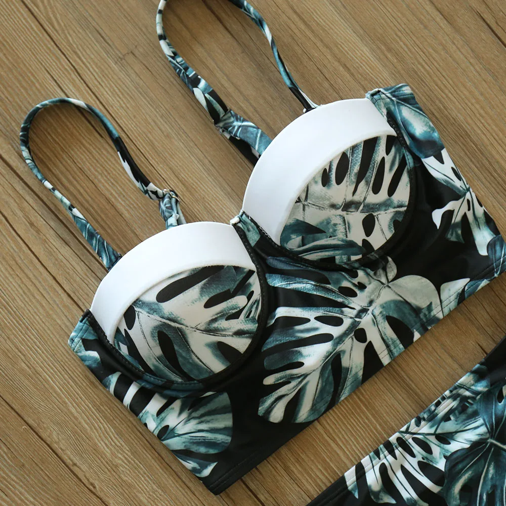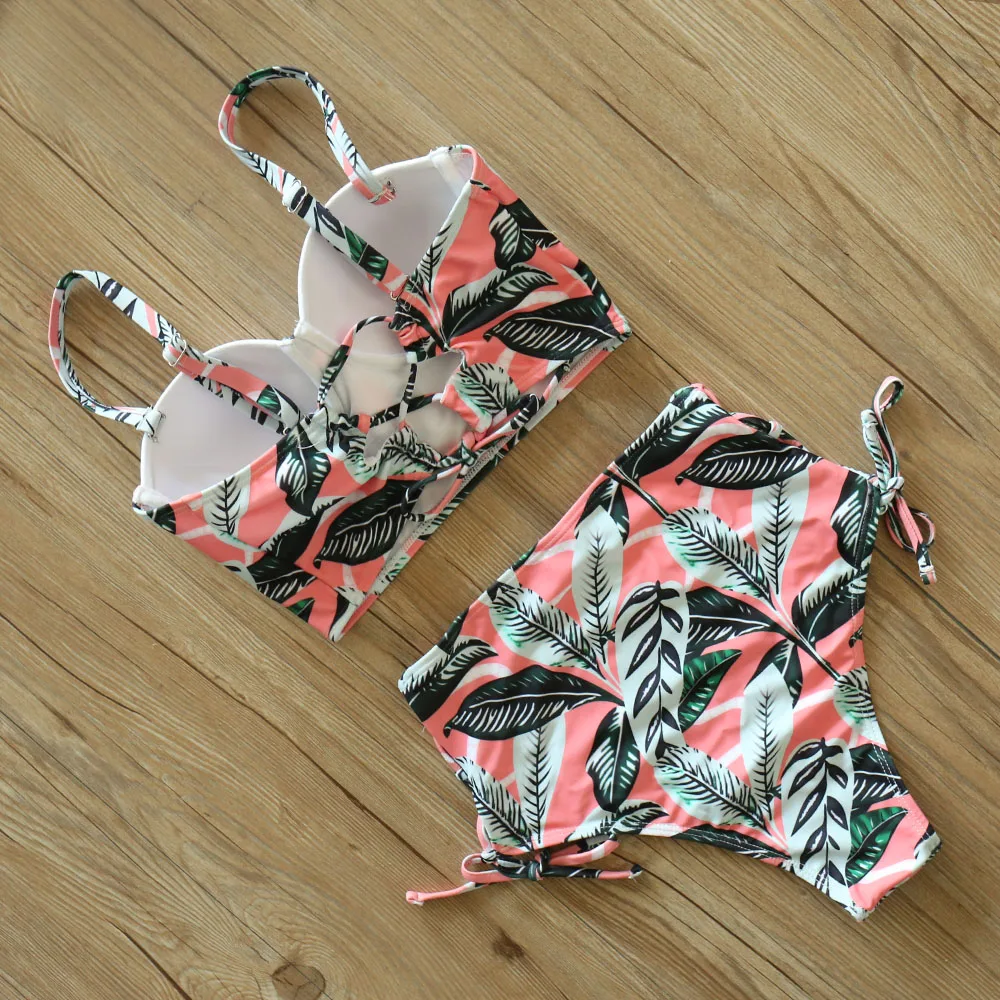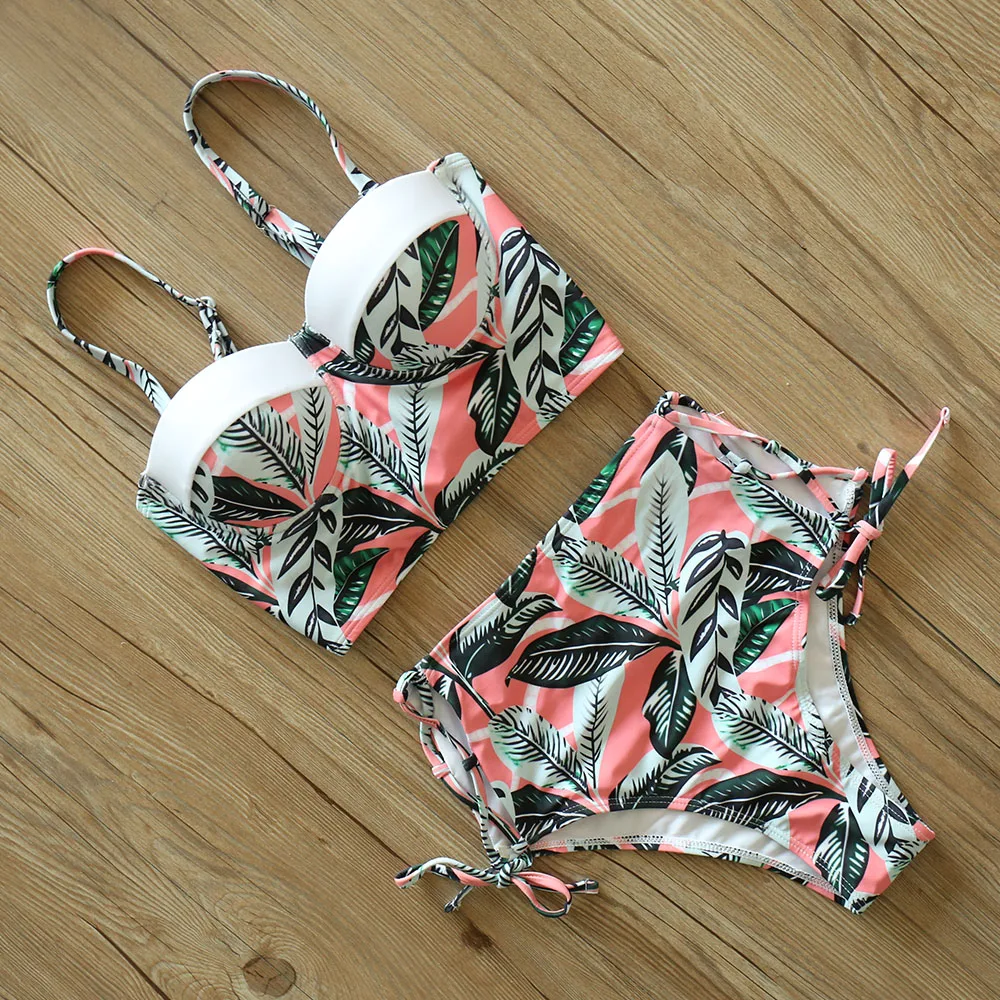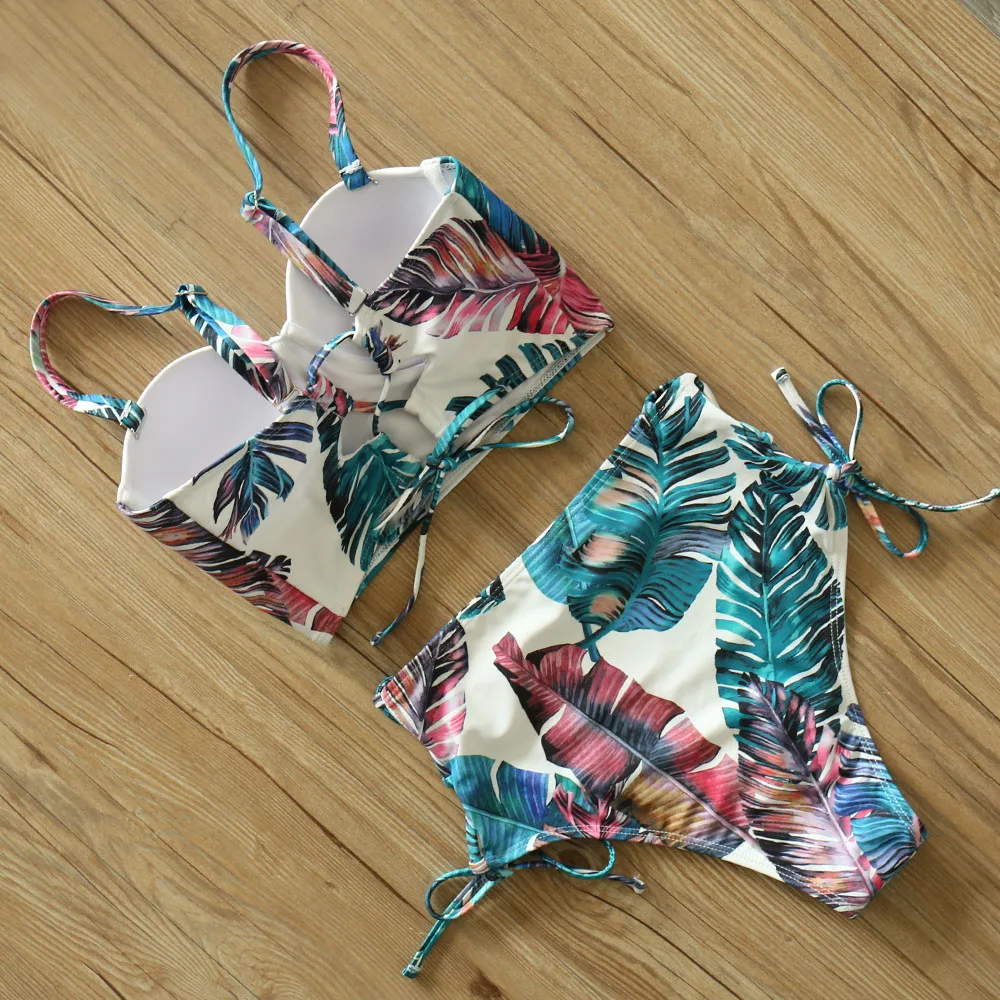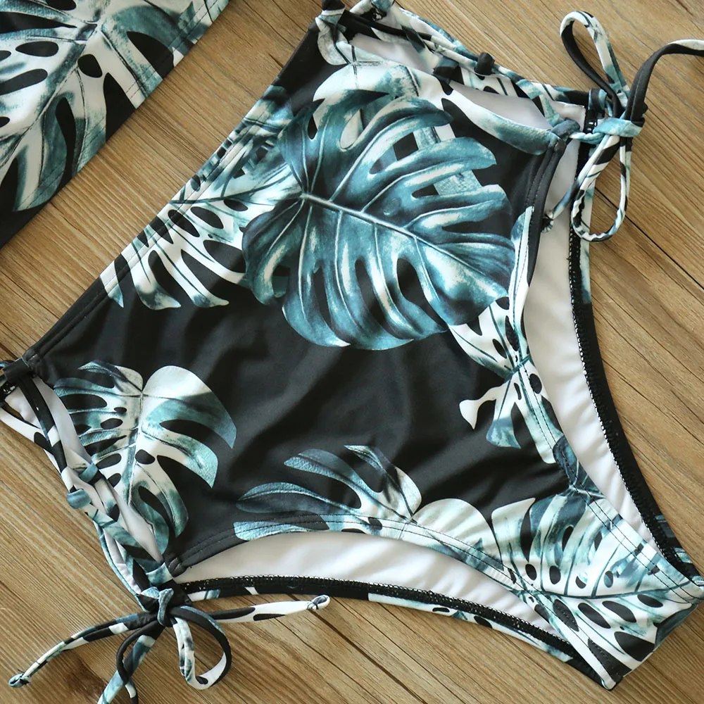 Купальники с высокой талией, новинка 2021, бикини с принтом листьев, женский купальник, винтажный Ретро купальный костюм, бикини с лямкой на шее