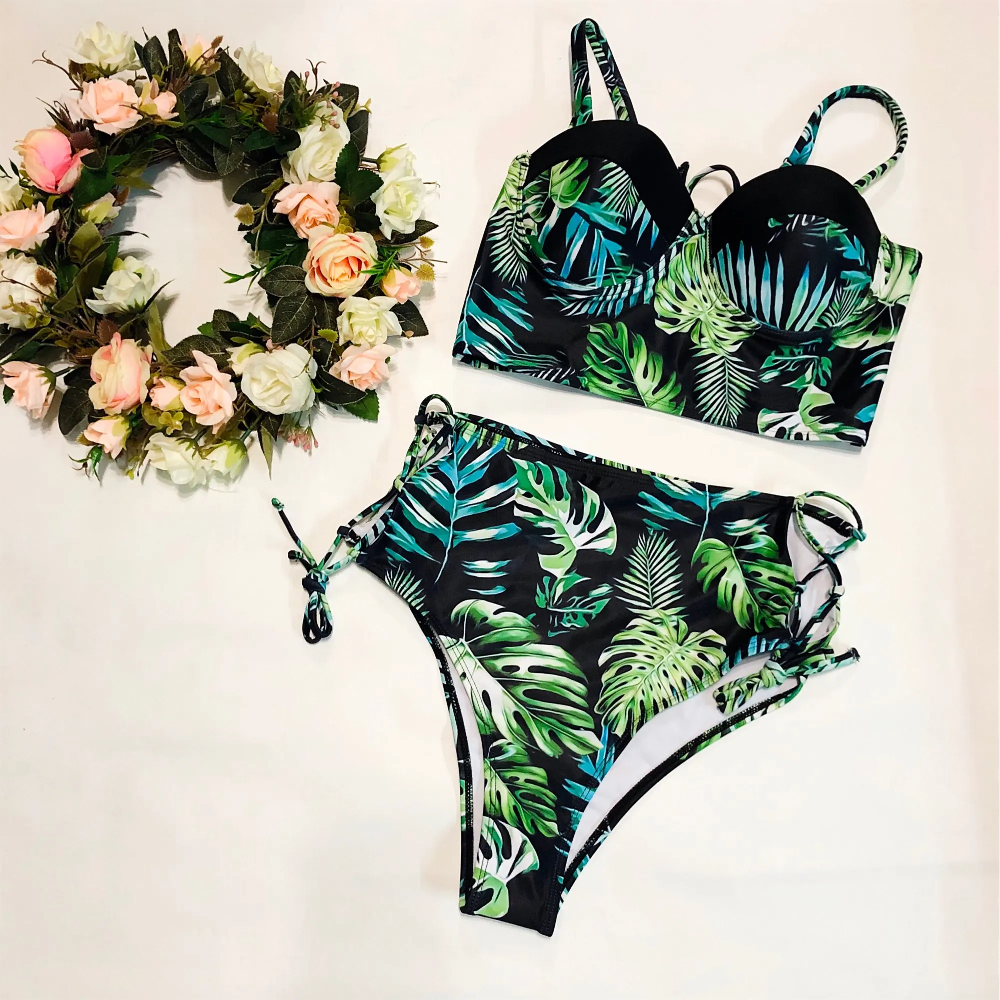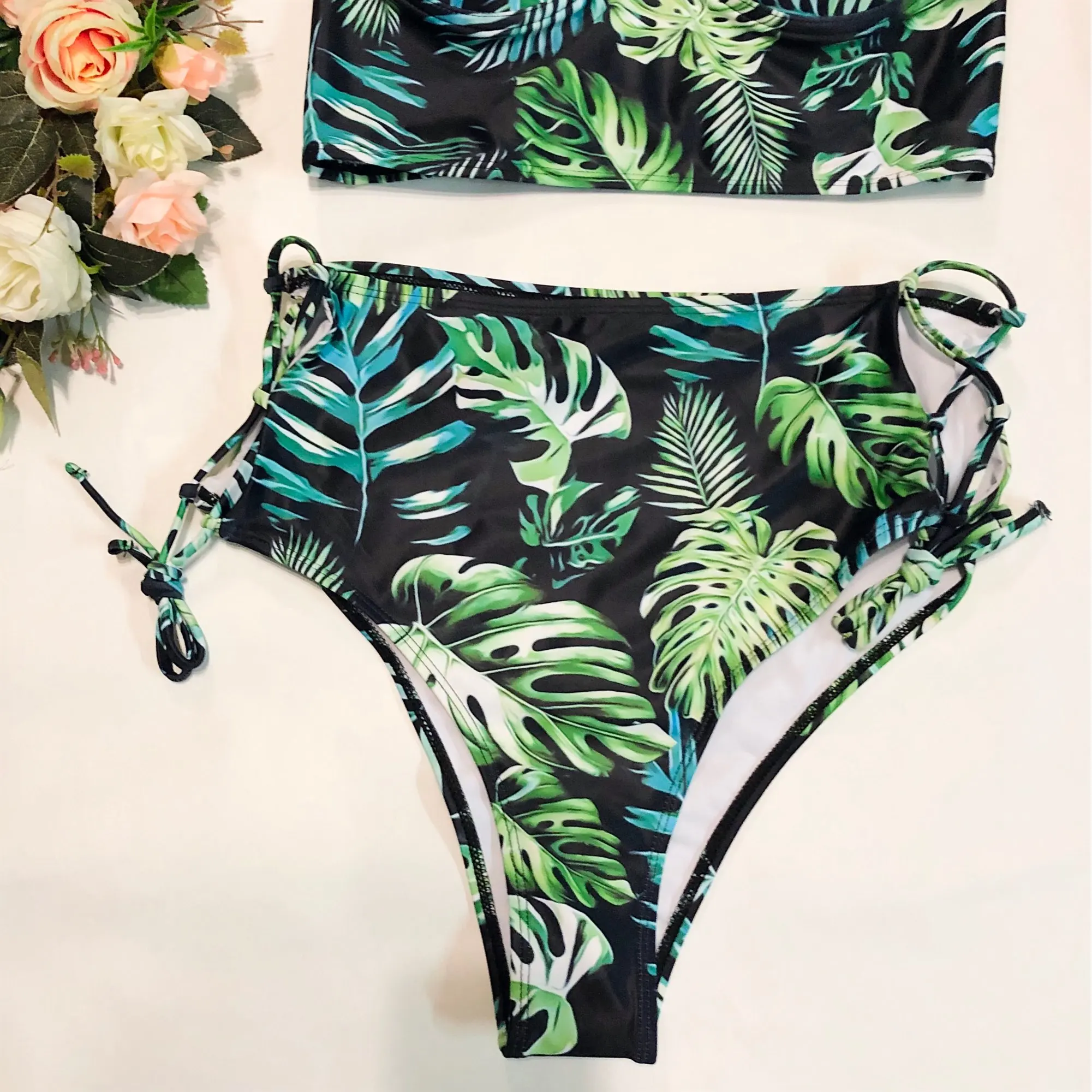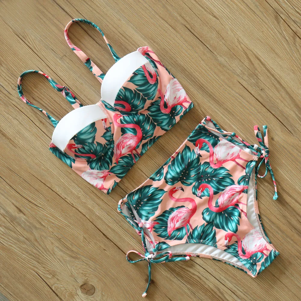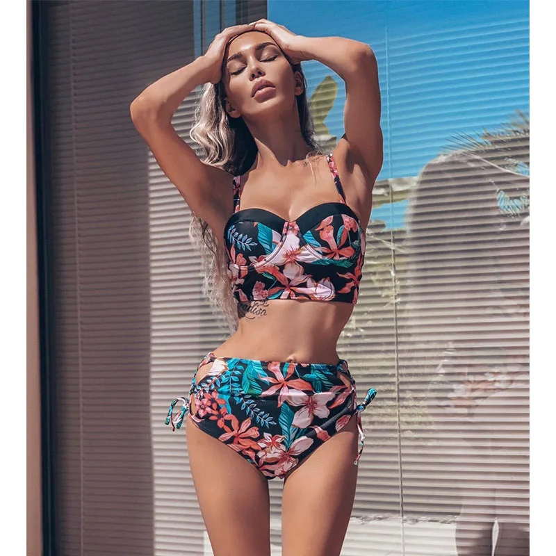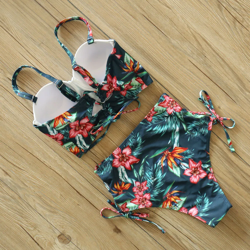 Купальники с высокой талией, новинка 2021, бикини с принтом листьев, женский купальник, винтажный Ретро купальный костюм, бикини с лямкой на шее