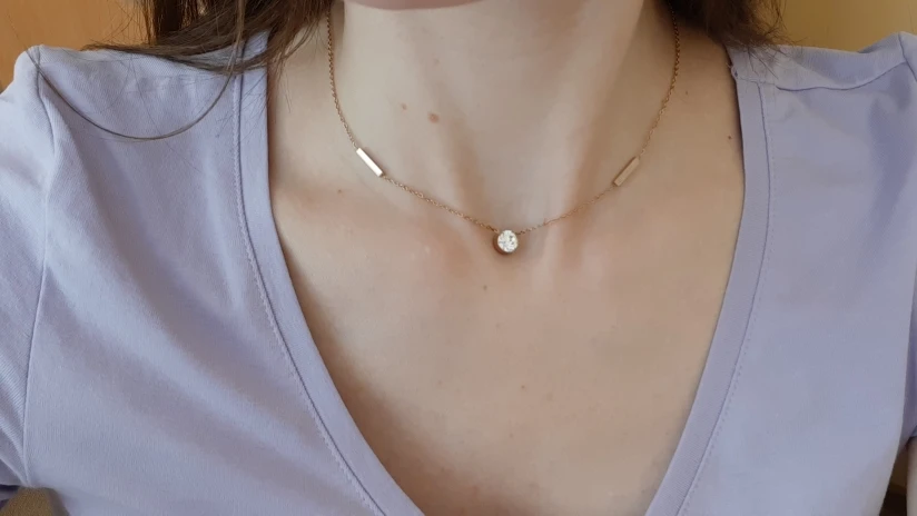 За 4 года у меня не потемнело ни одно изделие. Рекомендую этого продавца. Качество - супер!!! В данном колье (для меня) камень немного тускловатый. Жаль. Цепочка нежная, качественная и красивая
