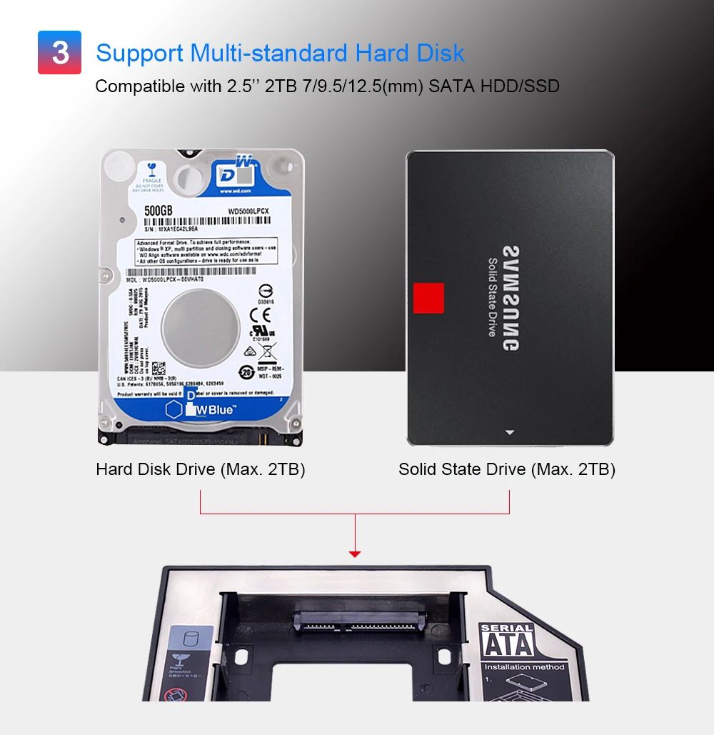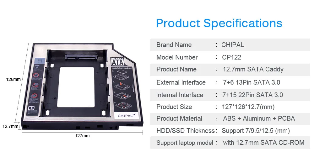 Переходник CHIPAL для установки второго жесткого диска 12,7 мм, 2,5 дюйма, 2 ТБ SATA 3,0, чехол для жесткого диска, корпус жесткого диска HD со светодиодной подсветкой для оптического привода ноутбука