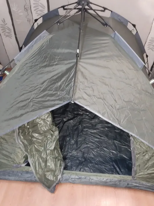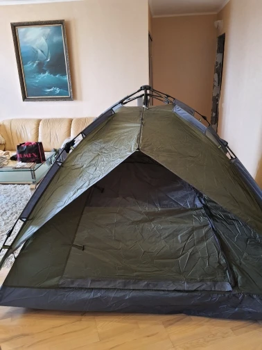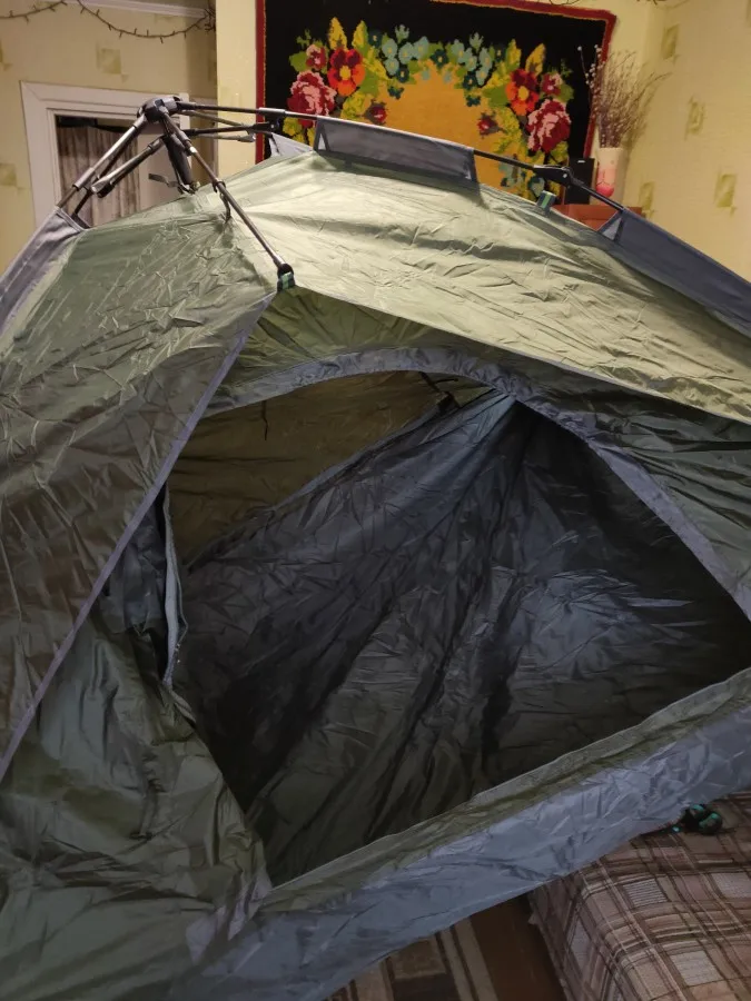 Ну,заказывал цвет оливу в переписке написали нет оливы есть зелёный,но заказывал и оплачивал то я оливу.Привезли прямо до двери.В комплекте есть колышки.Запах неприятный присутствует.Но на природе часа за 3-4 выветрится думаю.В отношении швов и конструкции в целом впечатление положительное.Оценки не дам.Решайте сами.