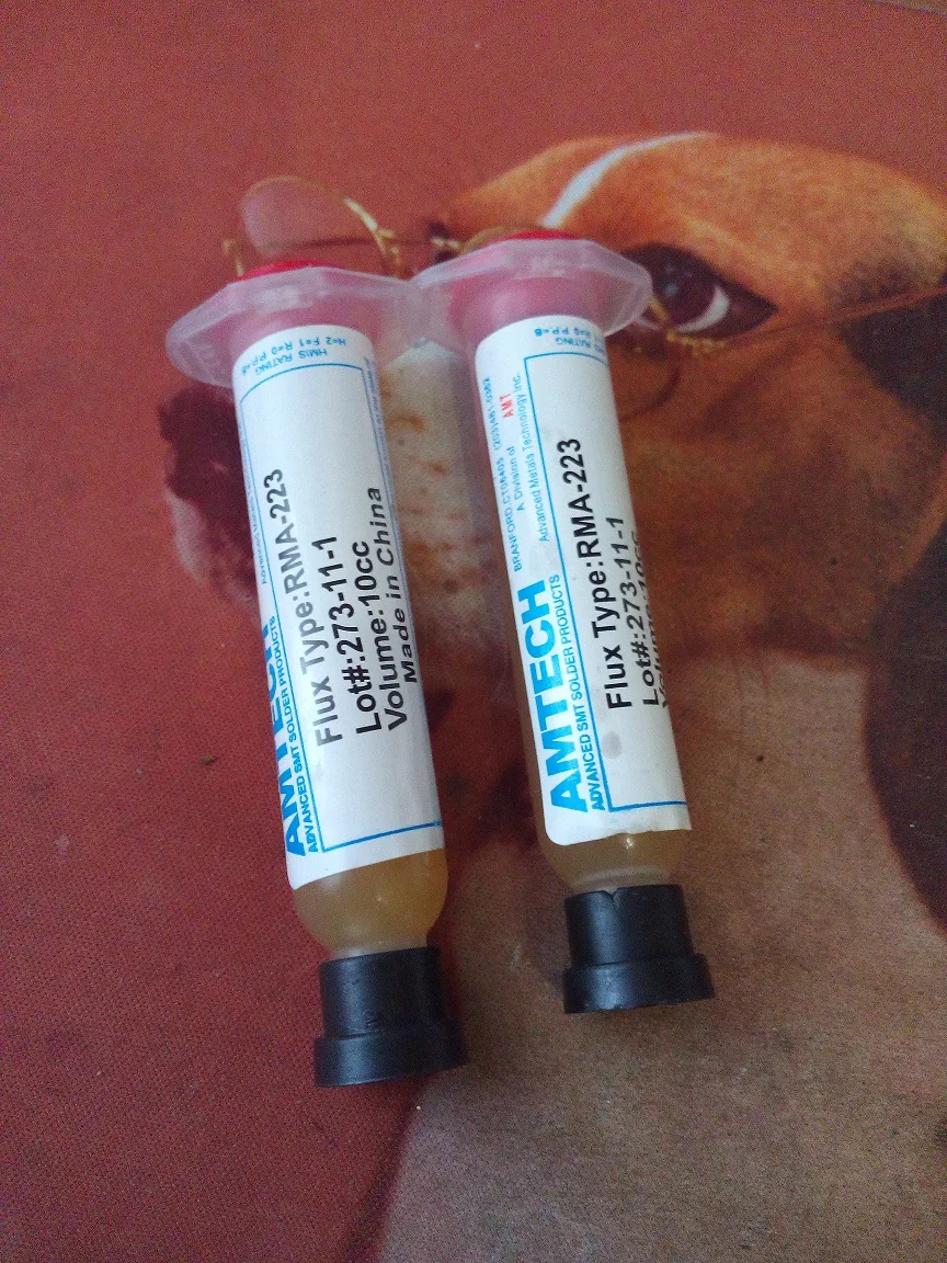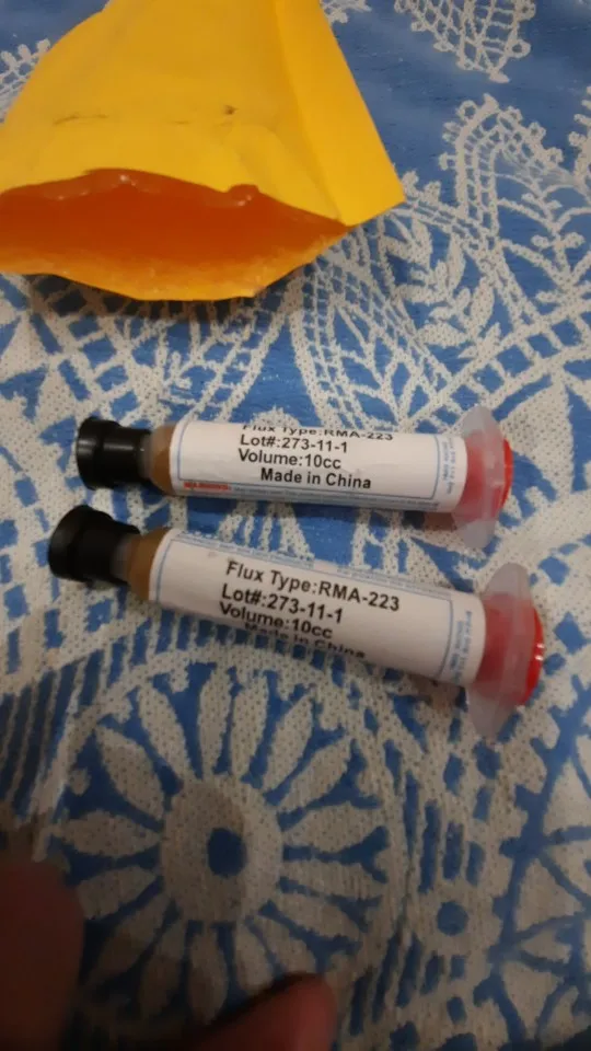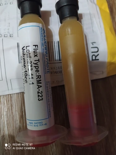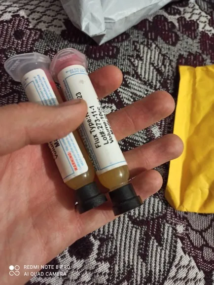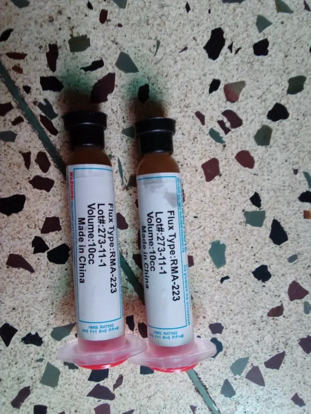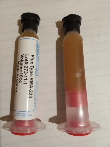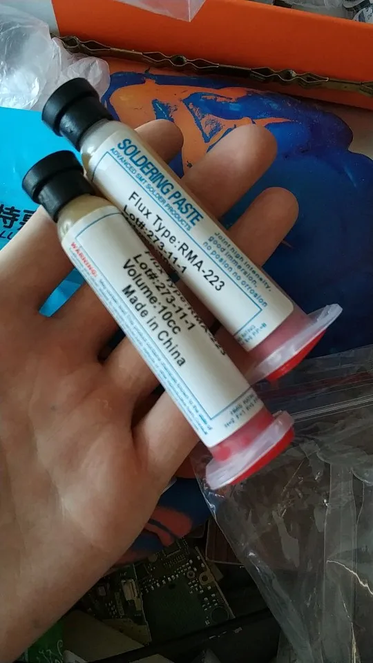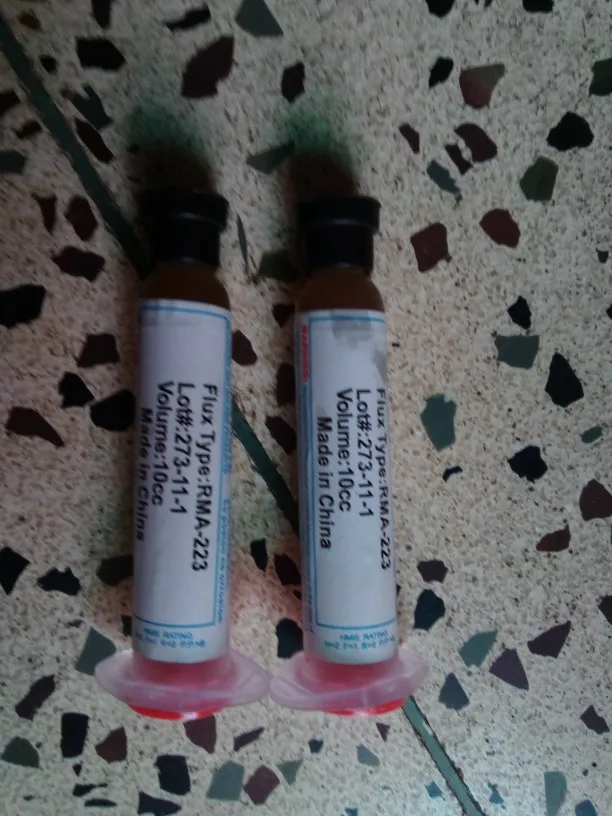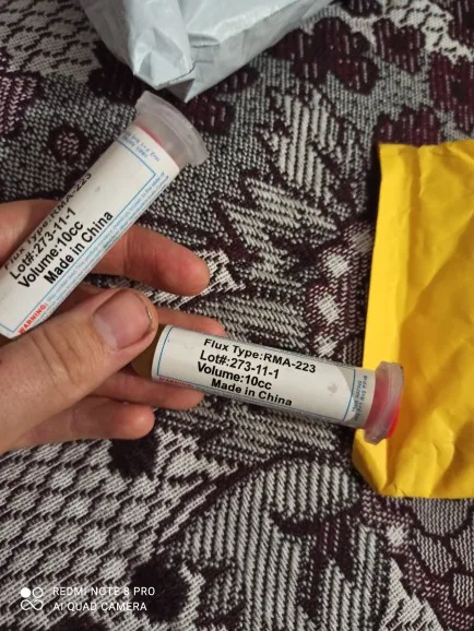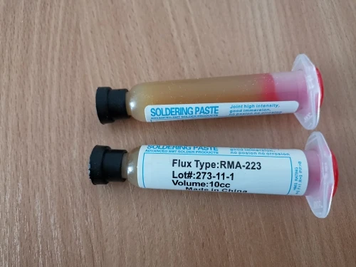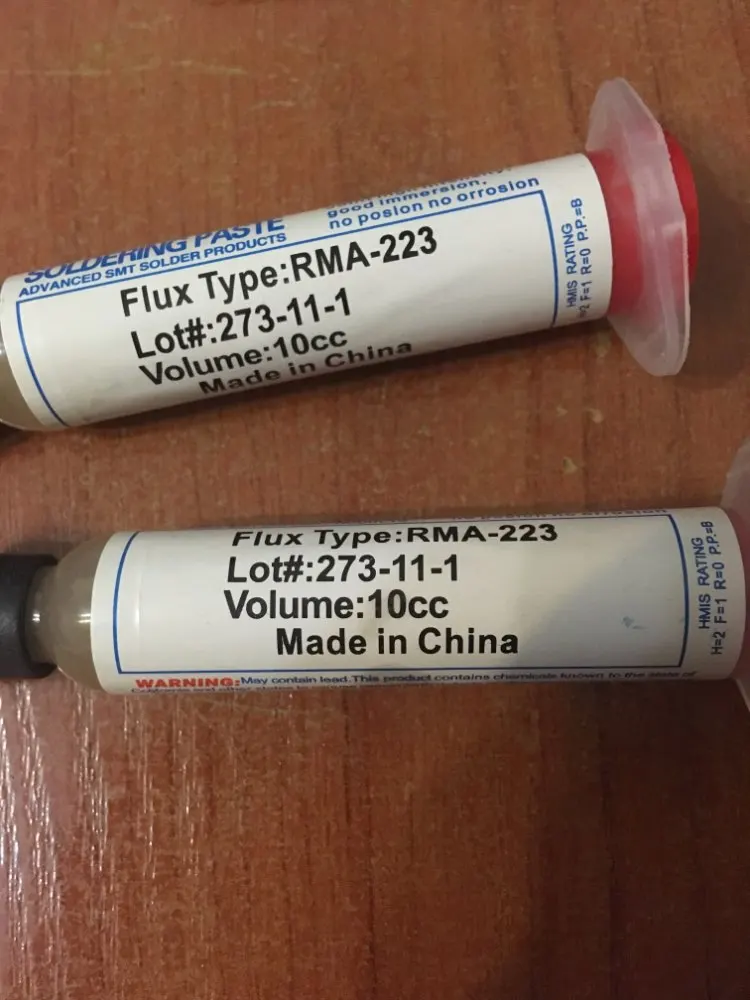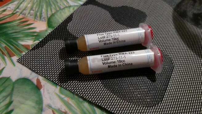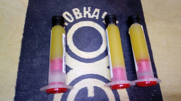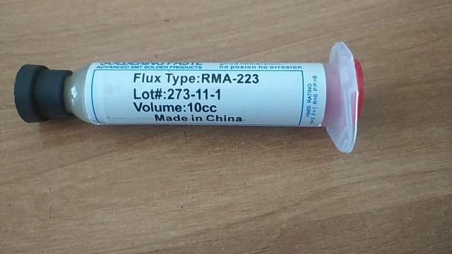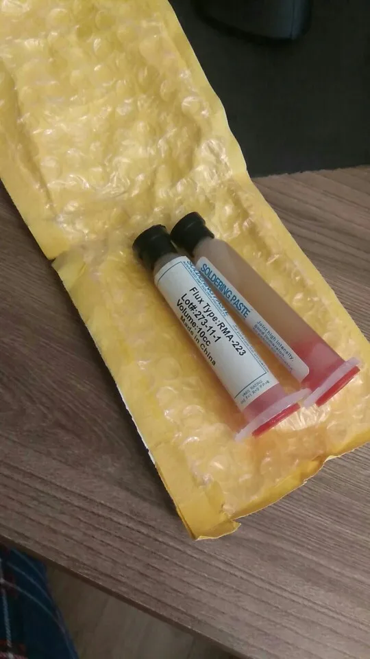 Посылка шла два месяца, по России не отслеживалась. Сам флюс нормальный, со своей задачей справляется, паять можно. Особо не оставляет следов на плате и легко смывается спиртом. Перед использованием выдавил содержимое в обычный шприц, мне так удобнее.
