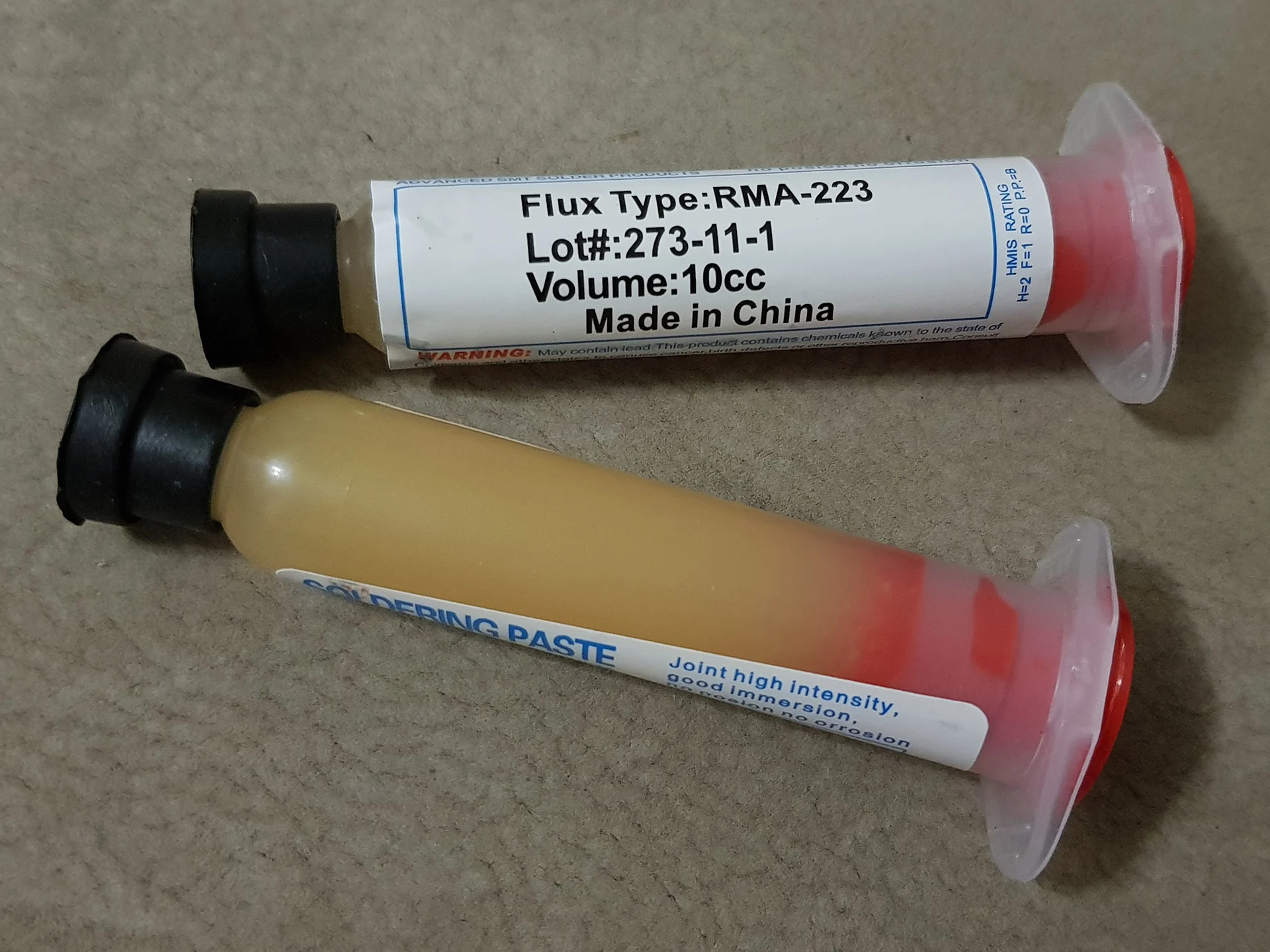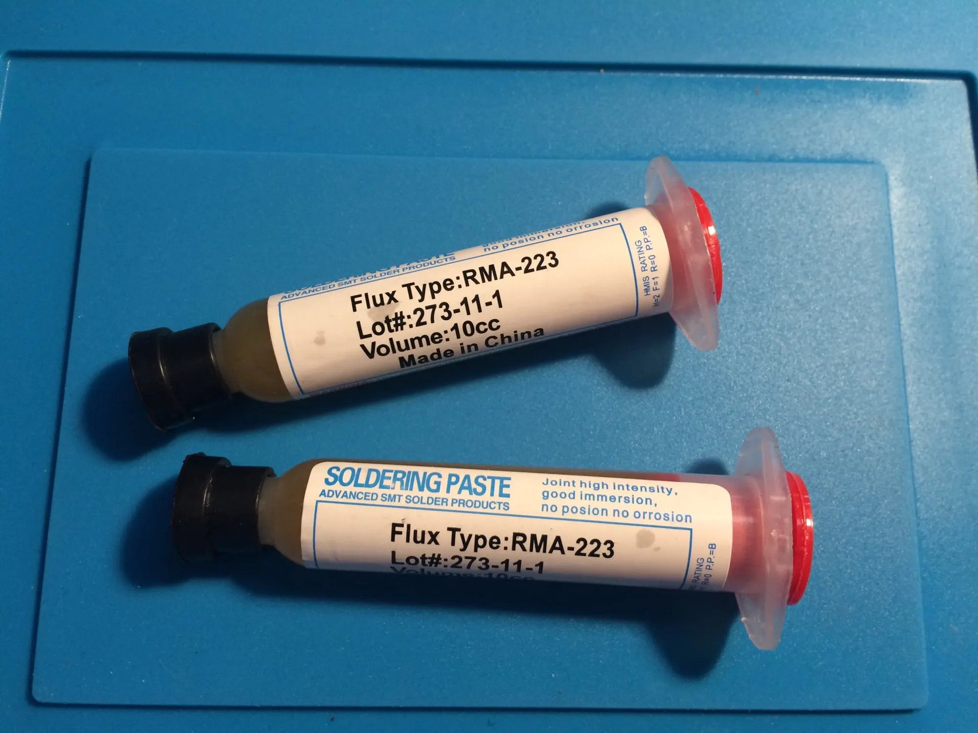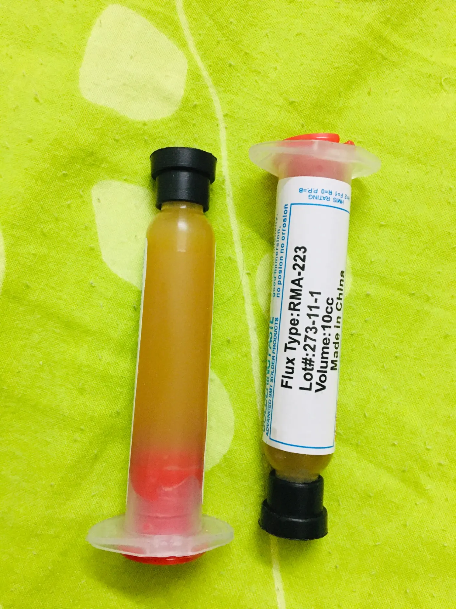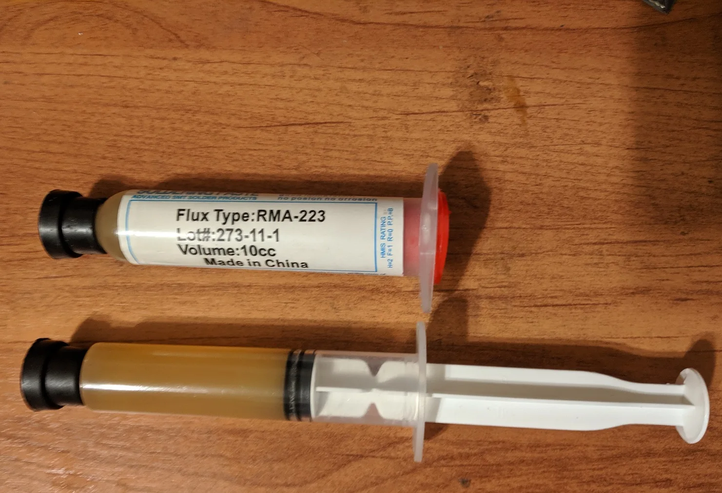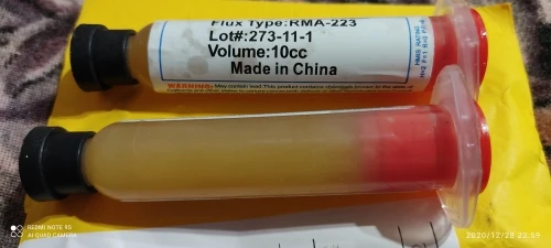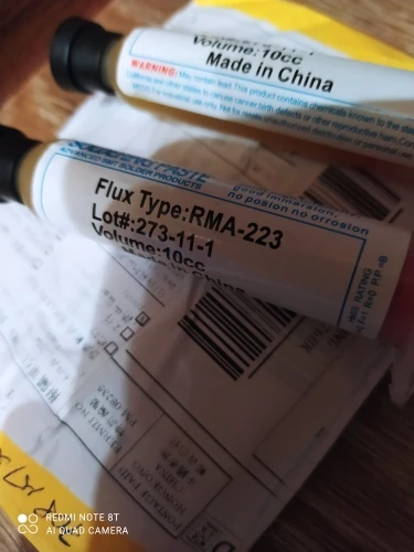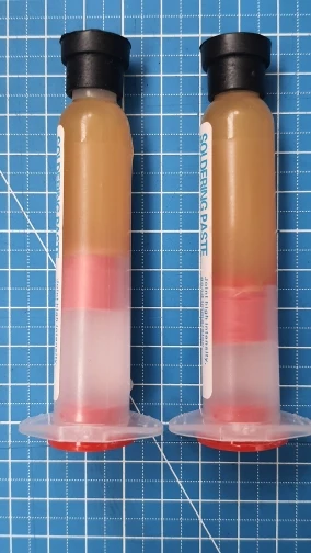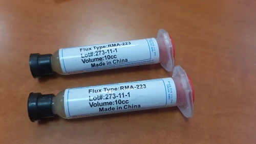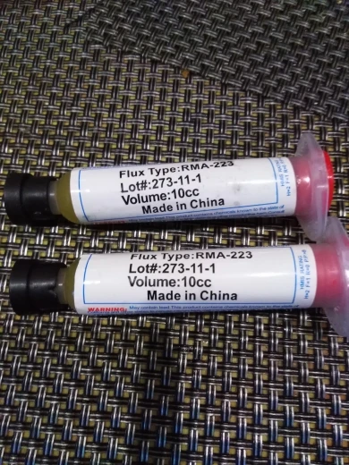 Посылка шла два месяца, по России не отслеживалась. Сам флюс нормальный, со своей задачей справляется, паять можно. Особо не оставляет следов на плате и легко смывается спиртом. Перед использованием выдавил содержимое в обычный шприц, мне так удобнее.