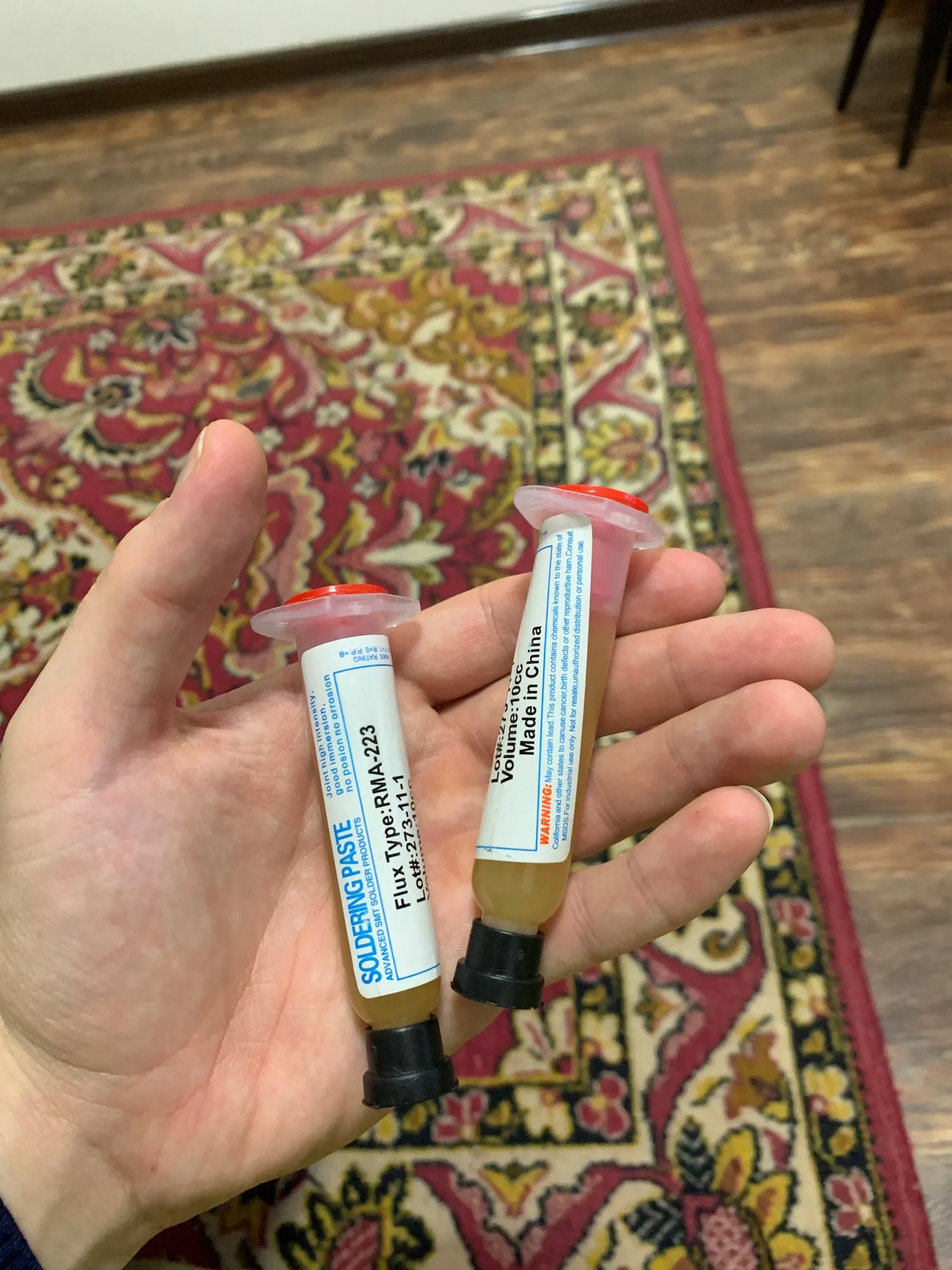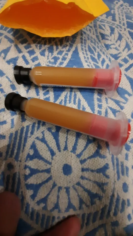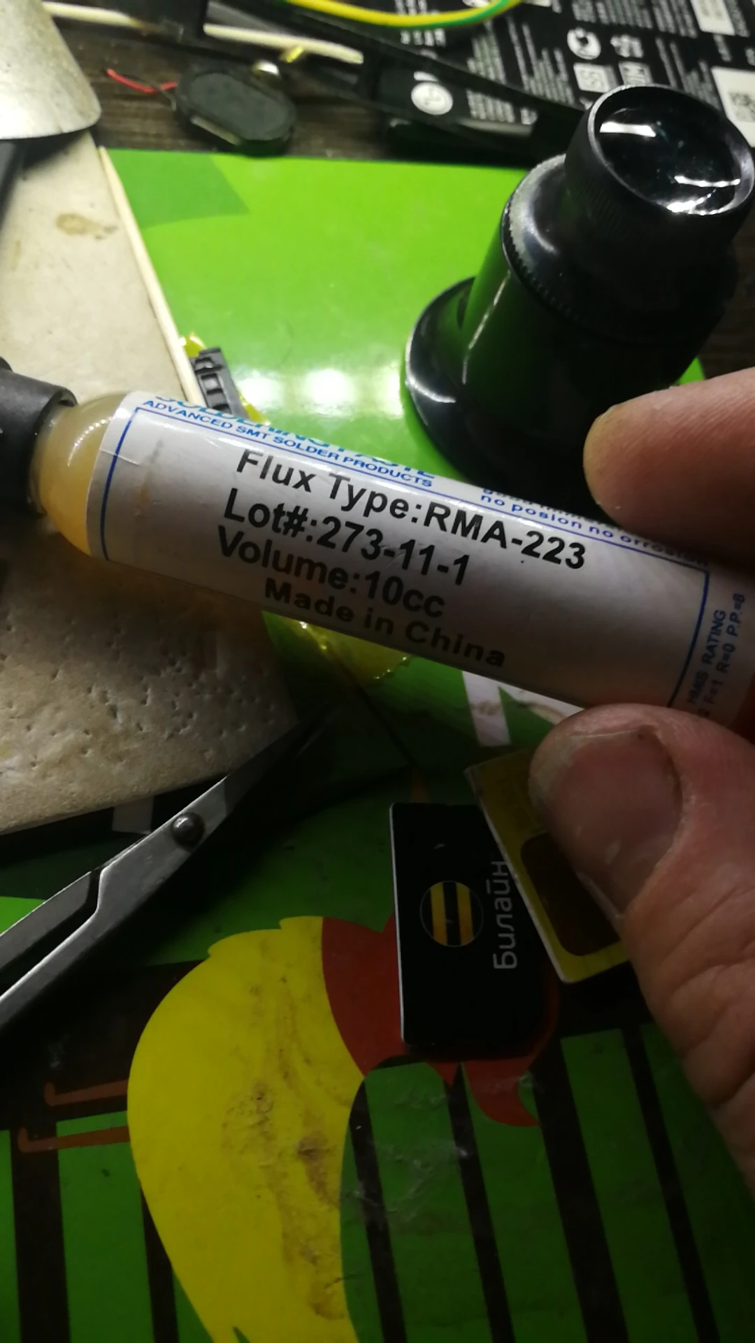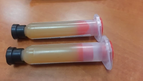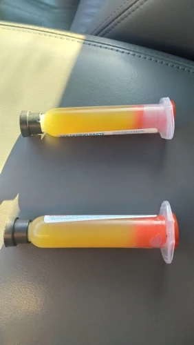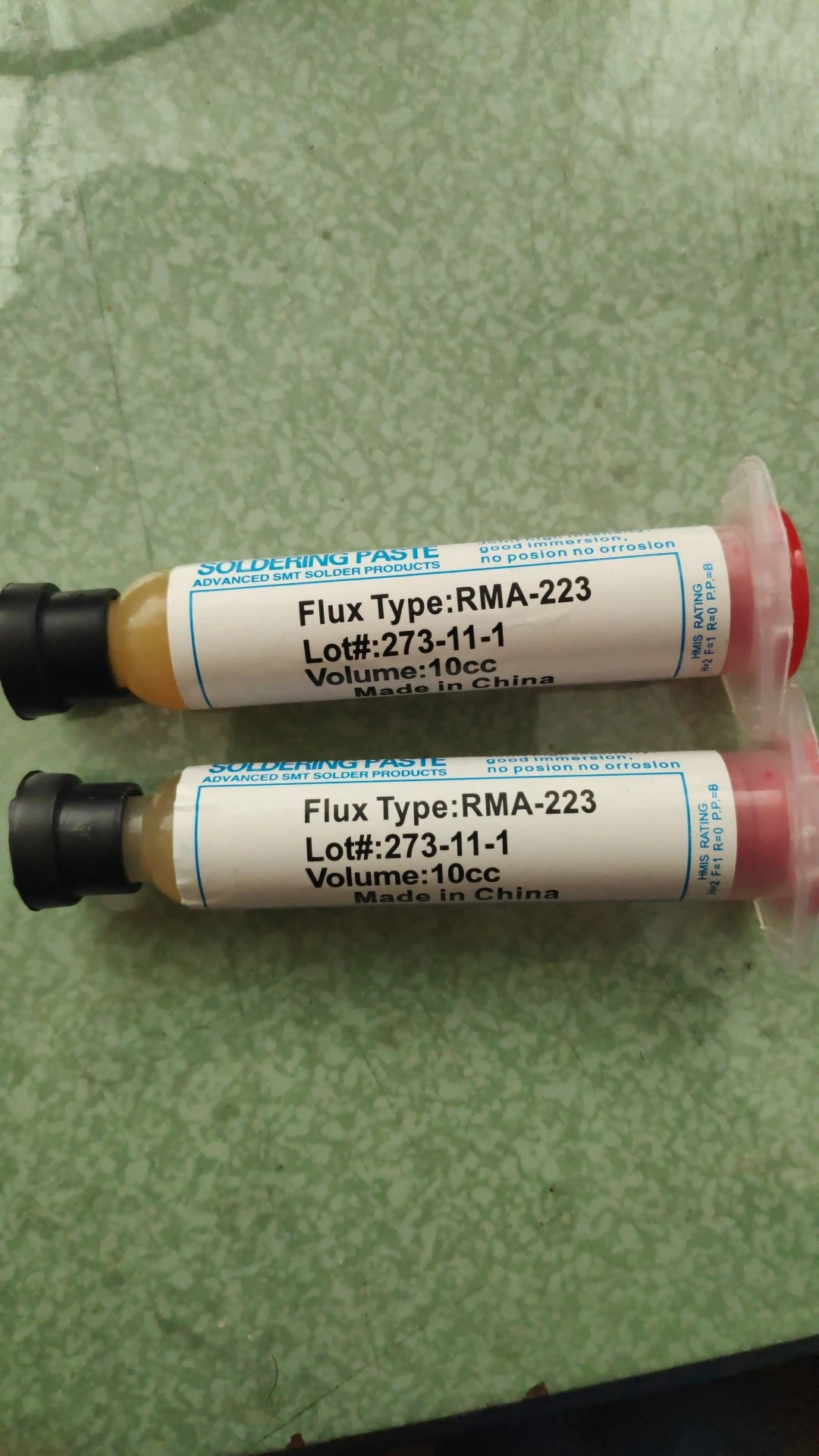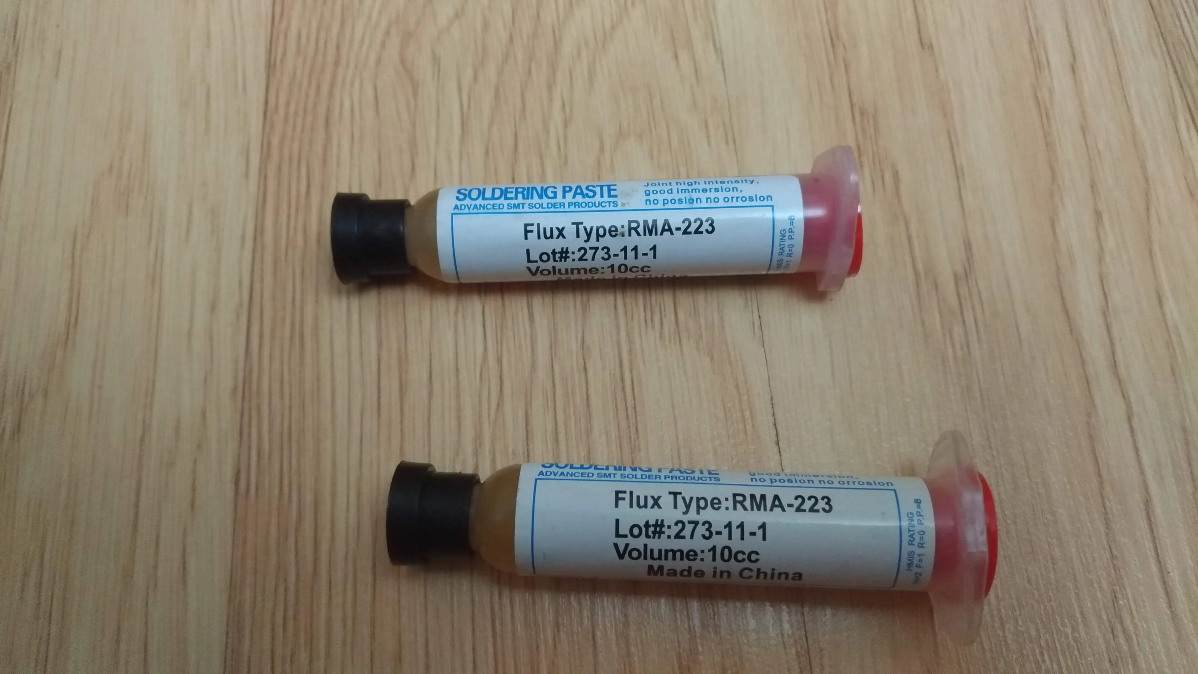 Посылка шла два месяца, по России не отслеживалась. Сам флюс нормальный, со своей задачей справляется, паять можно. Особо не оставляет следов на плате и легко смывается спиртом. Перед использованием выдавил содержимое в обычный шприц, мне так удобнее.