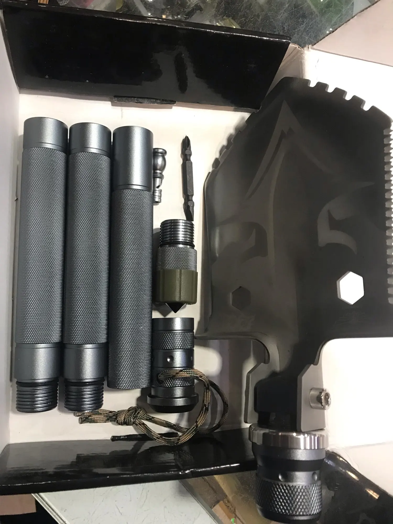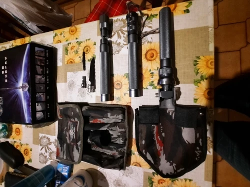 Лопата пришла быстро. Полный комплект с огневом. Проверил рабочее, надо чиркнуть по нему ножом с усилием и будут искры. Только компас сразу выпал из ручки и оказался не рабочим. Заказывал доставку из Росси. Брал как подарок отцу за 1446 рублей. За свою цену лопатка огонь.