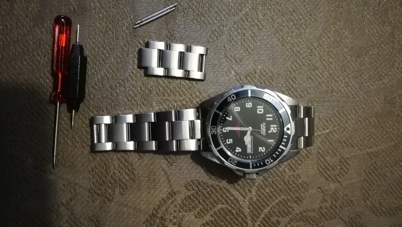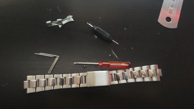 Ремешок хорошего качества. Винты удерживают дополнительные звенья (без штифтов). В комплект также входят дополнительные пружины, пружинный брусок и отвертка. Все по очень разумной цене. Мой единственный комментарий в том, что мое запястье не очень большое, и лента была близка к максимальной длине, не снимая ссылки. Они могут, вероятно, включать и дополнительную ссылку или две для наших полных американских запястья!