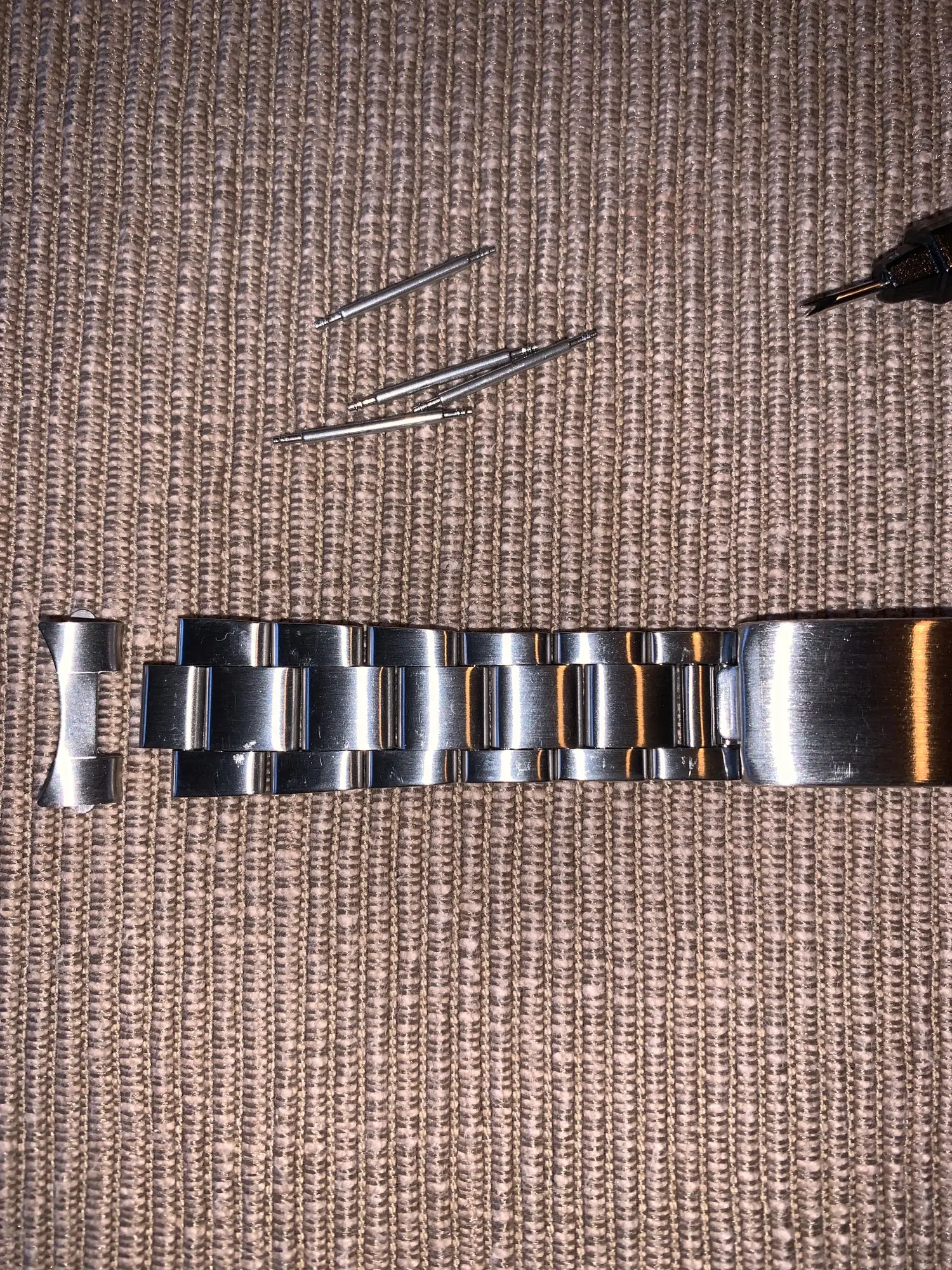 После распаковки пластика, ремешок имеет некоторые существующие повреждения. Самая большая проблема для меня, она не подходит для моего Ролекс 6694,19 мм, пробовал более часа, вывод ее невозможно получить шпильки внутри отверстий, потому что они не находятся достаточно близко к отверстиям. Несколько человек примерили это.