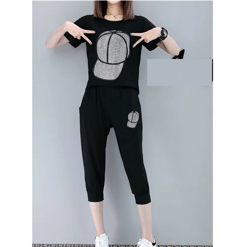 Спортивный костюм UHYTGF Женский, тонкий повседневный костюм из двух предметов, модная шапка со стразами, большие размеры 5XL, лето 287