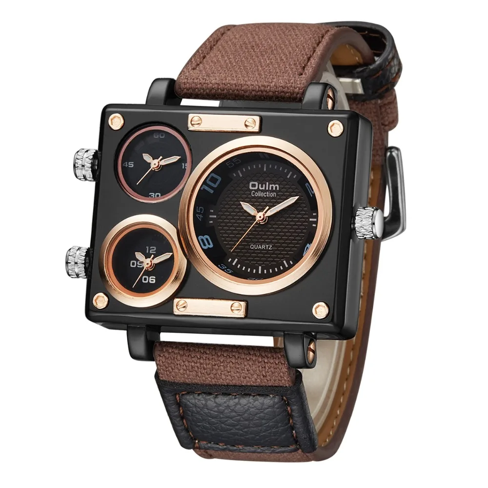 Часы наручные Oulm 3595 Мужские кварцевые, брендовые Роскошные уникальные дизайнерские модные с квадратным циферблатом, с 3 часовыми поясами
