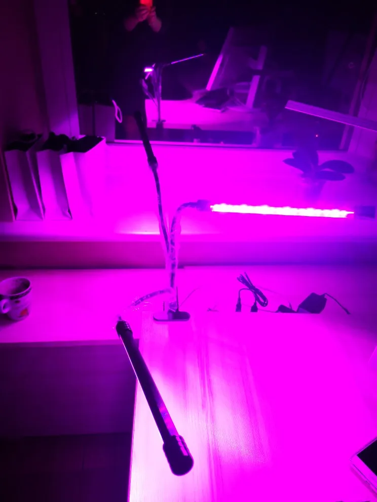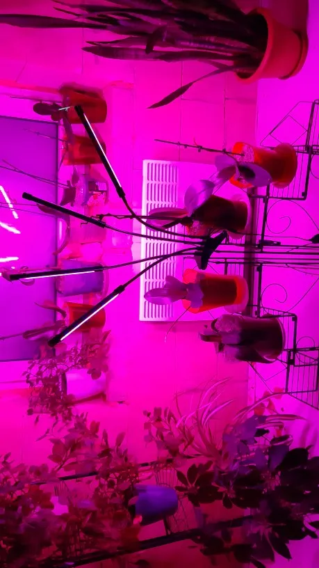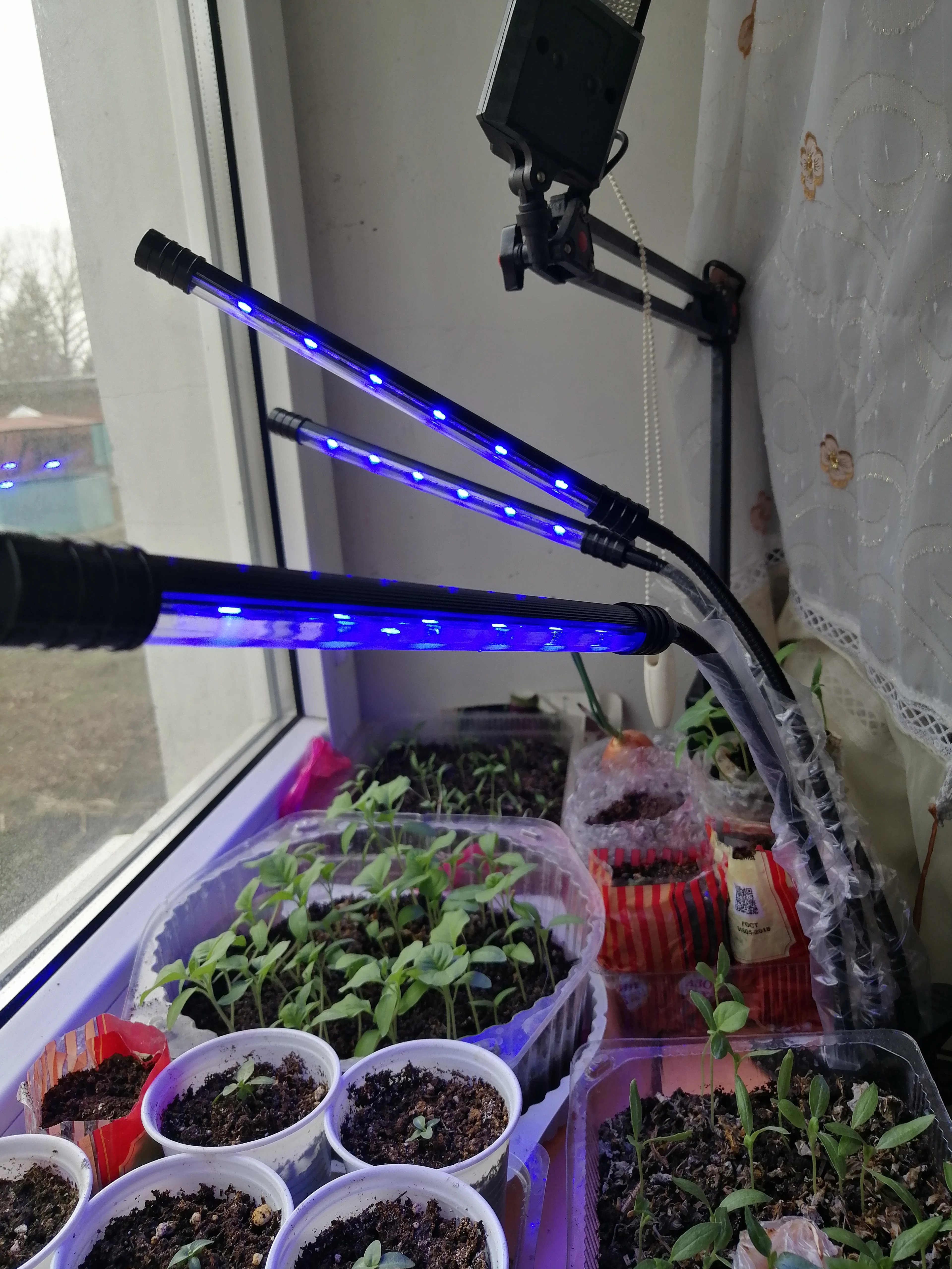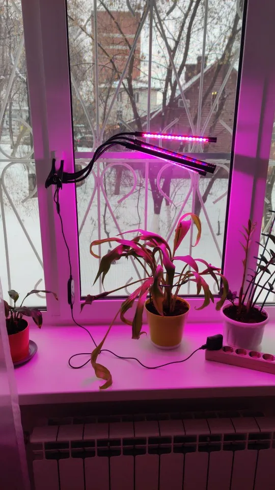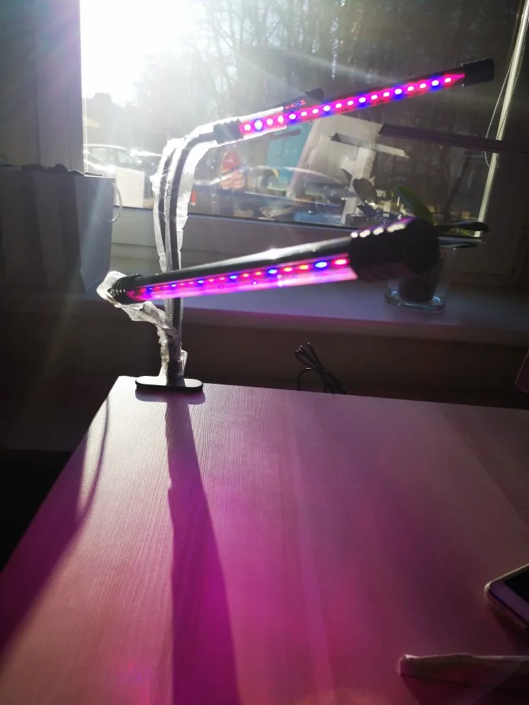 Покупала лампу с четырьмя "щупальцами". Лампа имеет несколько режимов интенсивности свечения, может светить только красным, только синим или двумя сразу, то есть розовым. Есть таймер на 4, 8 и 12 часов, все режимы работают. Упакован светильник в картонную коробку, коробка пришла помятая, лампа не пострадала. Сами элементы лампы были завернуты в пакетики. Зажим крепкий, с поролоновыми краями, проволочных стержни гнутся и фиксируются в нужном положении отлично! А самое главное - растения отвернулись от окна к лампам!! Ставлю таймер на 8 часов подсветки с 11-ти до 19-ти. Зарядного блока в комплекте нет.