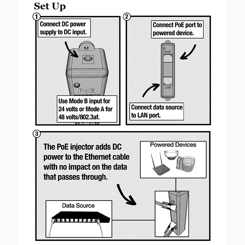Включите ip-камеру, настольный телефон, точку доступа WiFi или другие устройства низкого напряжения через сетевой кабель передачи данных с помощью этого инжектора питания через Ethernet (PoE). Инжектор PoE принимает питание от источника питания постоянного тока (источник питания продается отдельно) и добавляет его к вашему кабелю передачи данных Ethernet (Cat5, Cat5e, Cat6) к вашему устройству.