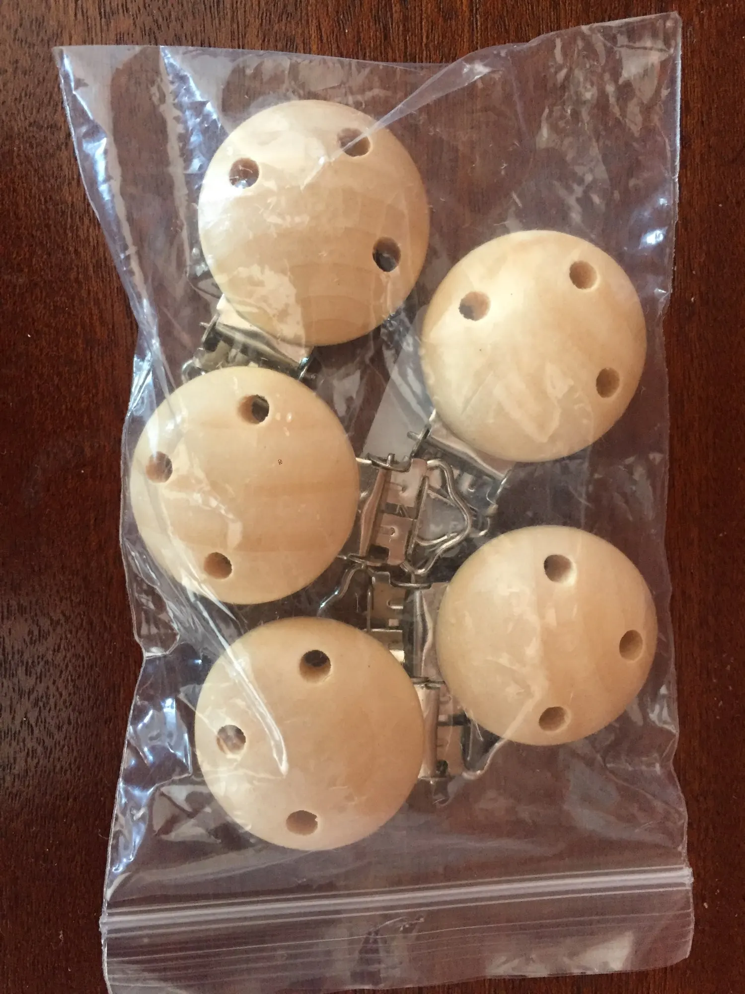 5 pinzas, todas en buen estado. Madera suave, clips cierran bien.