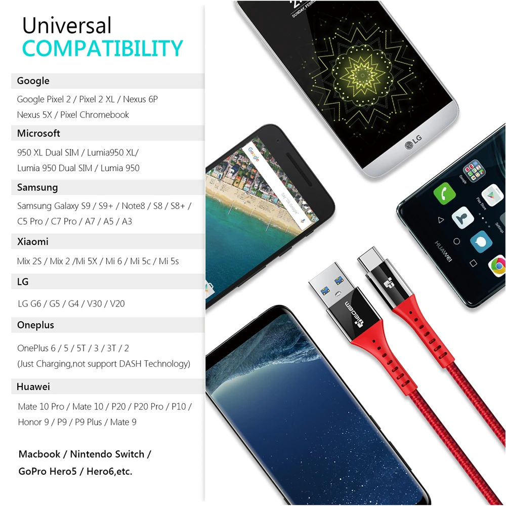 Compatible 1Type C Cable for Samsung Galaxy Note 8,S8 Plus,LG V30 V20