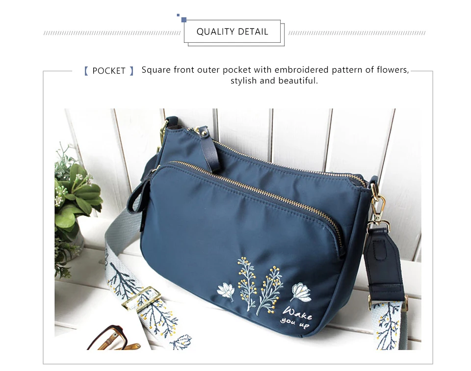 Сумка через плечо женская, нейлоновая, на широком ремешке, с цветочной вышивкой