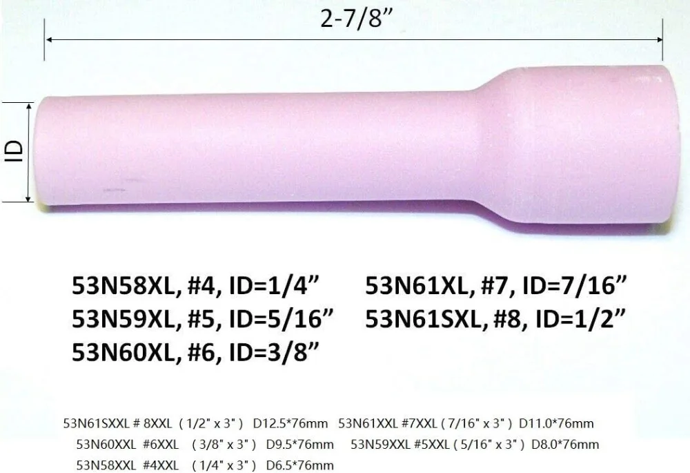 Посылка:Ref No: 53N59XXL ( # 5XXL 5/16 "отверстие)Размер: ( 5/16 "x 3" ) D8.0 * 76 ммКоличество: 5 шт.Эти керамические стаканчики из глинозема подходят для всех фонарей с воздушным охлаждением серии 9 и факелов с водяным охлаждением серии 20, включая PTA-9 Lincoln и PTA-20, Miller Diamondback DB9 и DB 20, вместе с WP-9 Weldcraft и WP-20 факелами.
