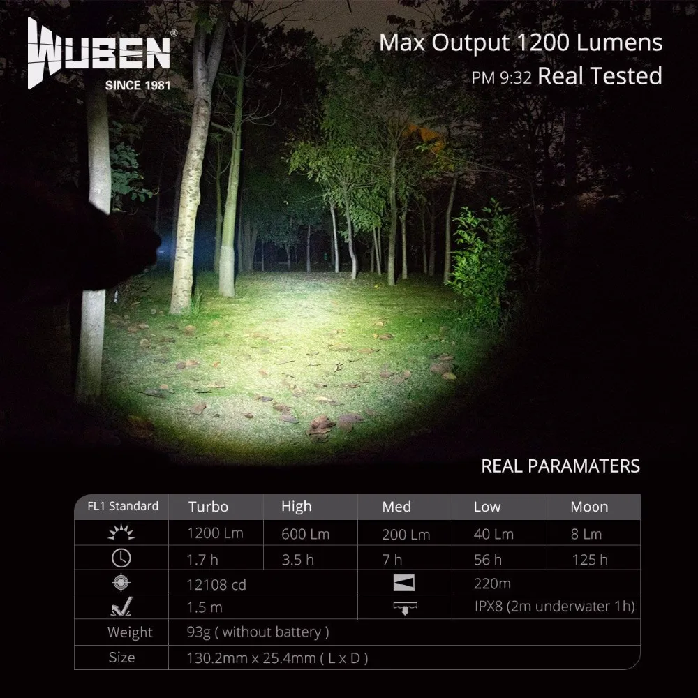【Ультра-яркий фонарик】WUBEN TO46R является профессиональным уличным фонариком, с жестким анодированным авиационным алюминиевым сплавом 6061. В фонарике есть 1 светодиод CREE XP-L-V6, максимальная выходная мощность до 1200 люменов, максимальное расстояние луча составляет около 720 футов.