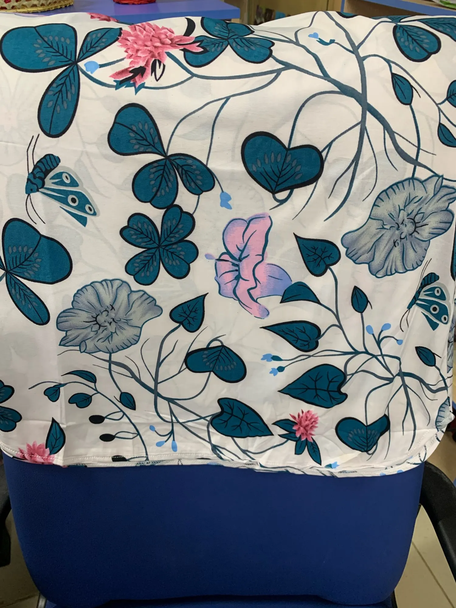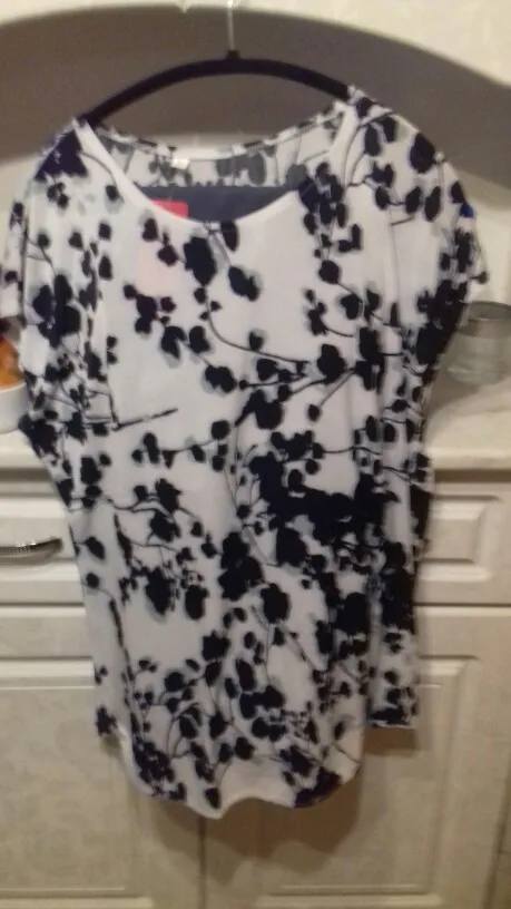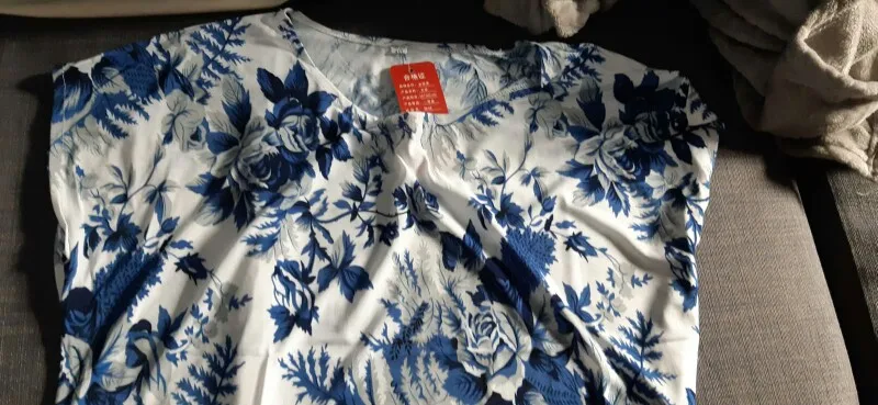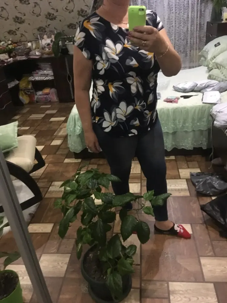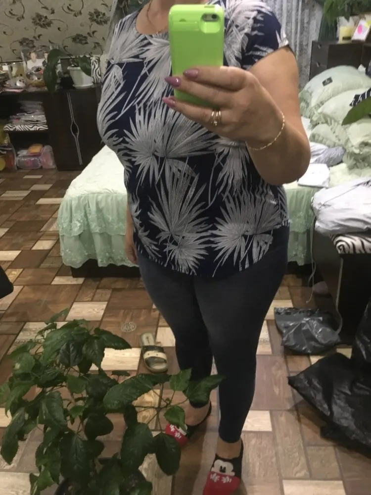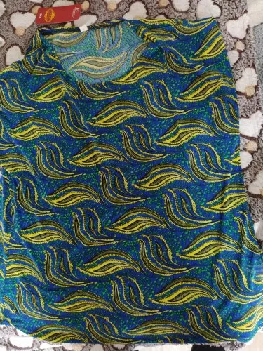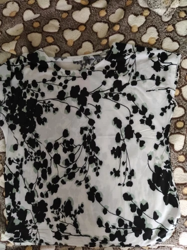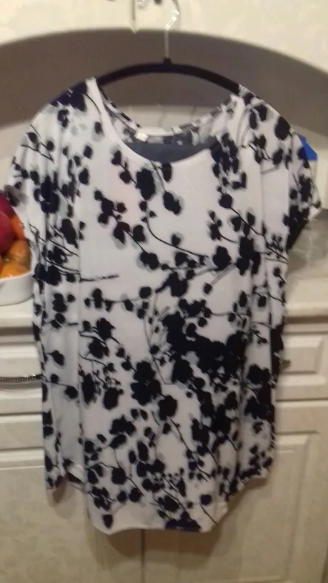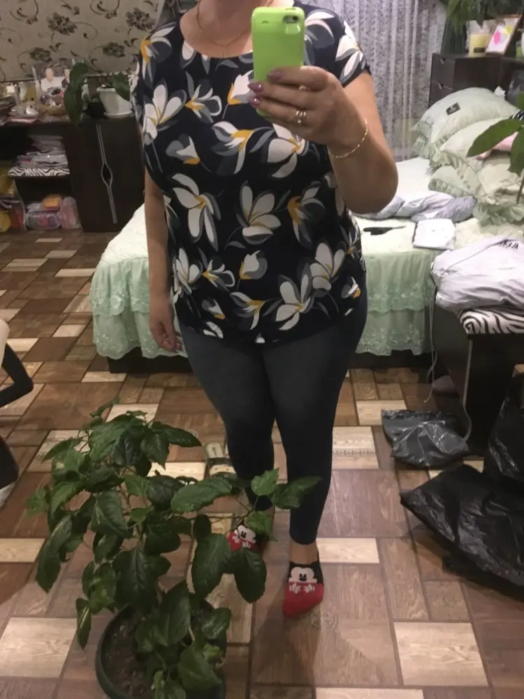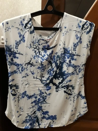 Качество хорошее. Размер 5XL подошел на российский 52-54 (ОГ 106), но на фото блузка смотрится приталенной, а на самом деле сидит свободно. Ткань шелковистая, синтетика.