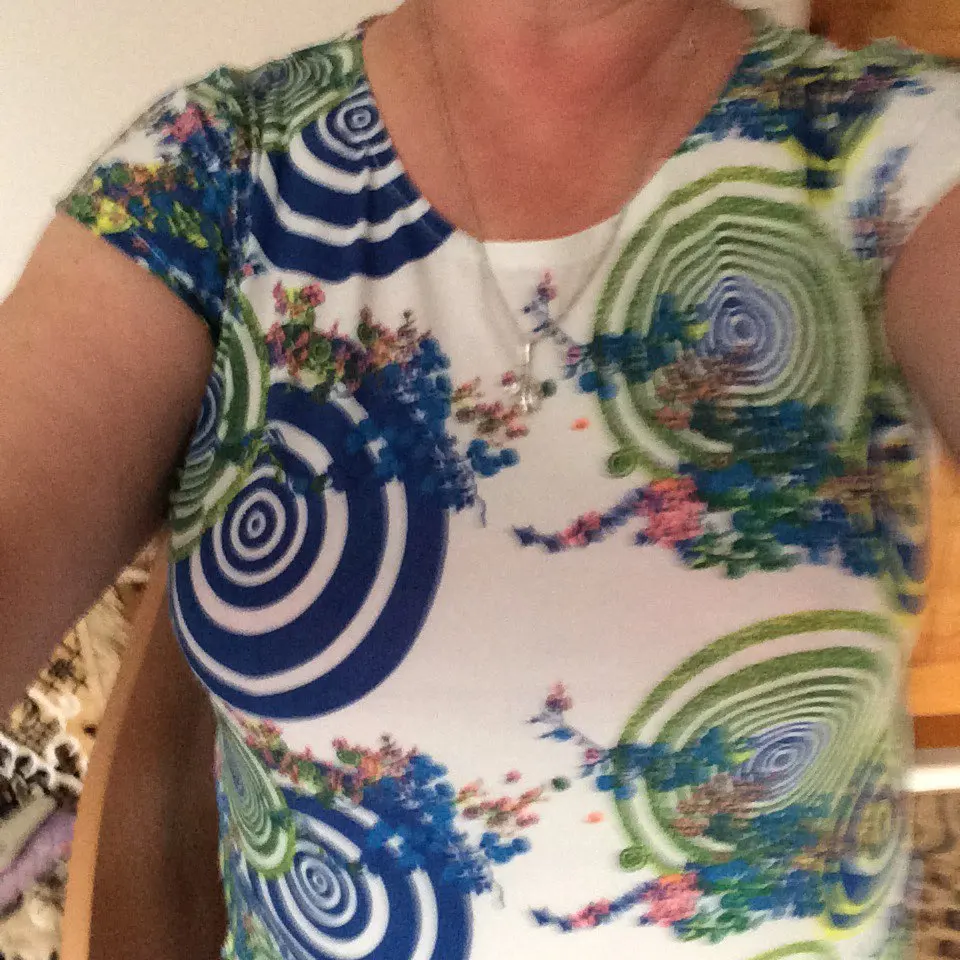 На обхват груди 104 см подошла хорошо, даже свободно. Но цвет отчичается. Расцветка блузки намного ярче, чем на картинке. Синтетика приятная к телу.