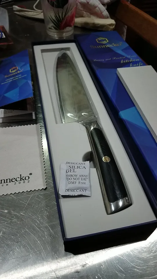 Это не моя первая покупка от Sunnecko, и не будет моей последней. Эти ножи фантастические, сделаны до совершенства и хорошо сбалансированы. Изысканная отделка и острее лезвия бритвы, они привлекают внимание и являются настоящей вещью красоты, которая приятно использовать и иметь. Они хорошо упакованы в презентационную коробку с поролоновой подкладкой и крышкой высокой плотности, полировочной тканью, информационным буклетом, пластиковой крышкой для лезвий и точечной защитой с глупым CA гель-осушителем Саше. Быстрая доставка в Таиланд и доставка на мой домашний адрес. Я рекомендую этот товар и этот продавец.