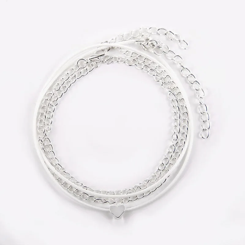 Женские многослойные ножные браслеты серебристого цвета в форме сердца, кожаная веревка, звеньевая цепочка, браслет на лодыжку, босоножки, ювелирные аксессуары