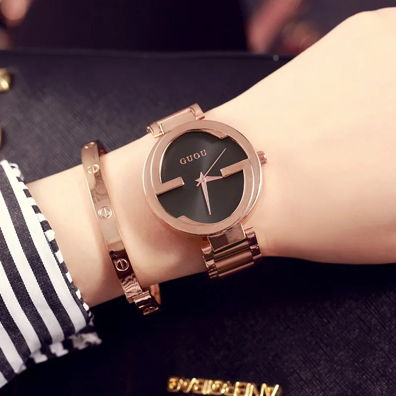 Часы наручные Guou женские кварцевые, брендовые Уникальные Роскошные повседневные, с браслетом под розовое золото, сталь