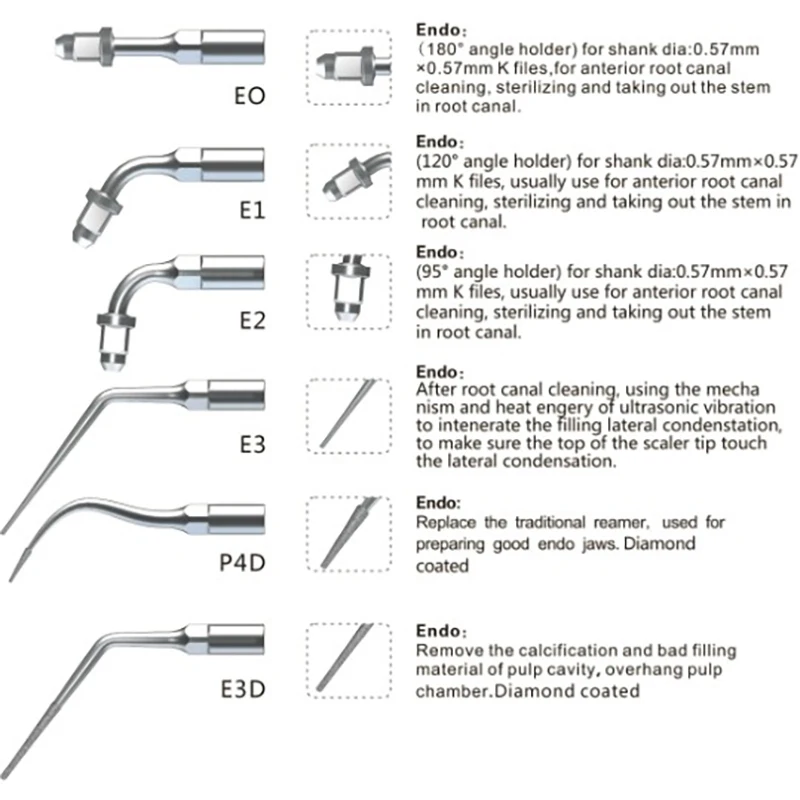 E0, Endo tip,(180 угловой держатель) для диаметра хвостовика: 0,57 мм × 0,57 мм K файлов, обычно используется для очистки переднего корневого канала, стерилизации и выведения штока в корневом канале.
