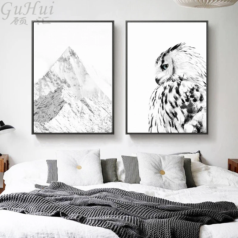 Постер с черно-белыми перьями в скандинавском стиле и печать букв Кот Сова горная живопись на холсте настенные картины для украшения гостиной