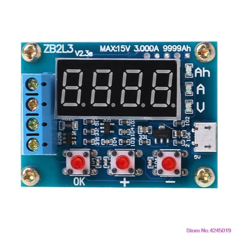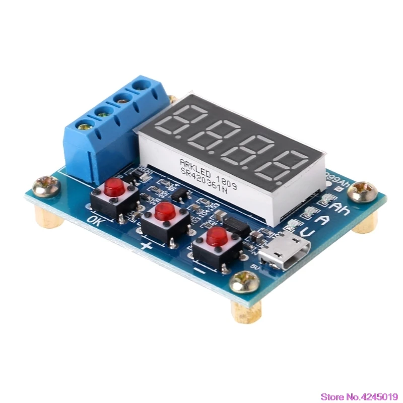 Характеристики:Напряжение источника питания: DC4.5-6V (разъем micro USB)Рабочий ток: менее 70 мАРазрядное напряжение: 1,00 V-15,00 V 0,01 V разрешениеВыходного напряжения диапазон: 0,5-11,0 VПоддерживается ток: разрешение 3.000A 0.001AПогрешность измерения максимального напряжения: 1% + 0,02 вМаксимальная погрешность измерения тока: 1.5% +-0,008aМаксимальный диапазон емкости аккумулятора: 9999Ah (1Ah = 1000mAh) большее значение, переключая десятичную точку на переключатель, когда дисплей меньше 10Ah X.XXX, как показано выше для достижения 10Ah XX.XX и так далее.Размер платы: 50 мм x 37 ммГотовый размер: 50 мм X 37 мм X 17 мм (Длина X Ширина X Высота Максимальный размер положения, содержит медь высота стопы)